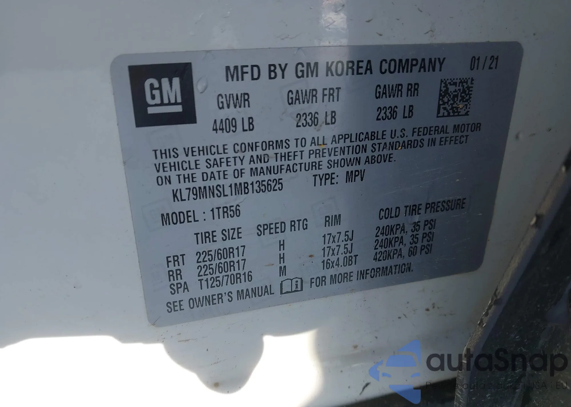LOT: 43914685 VIN: KL79MNSL1MB135625