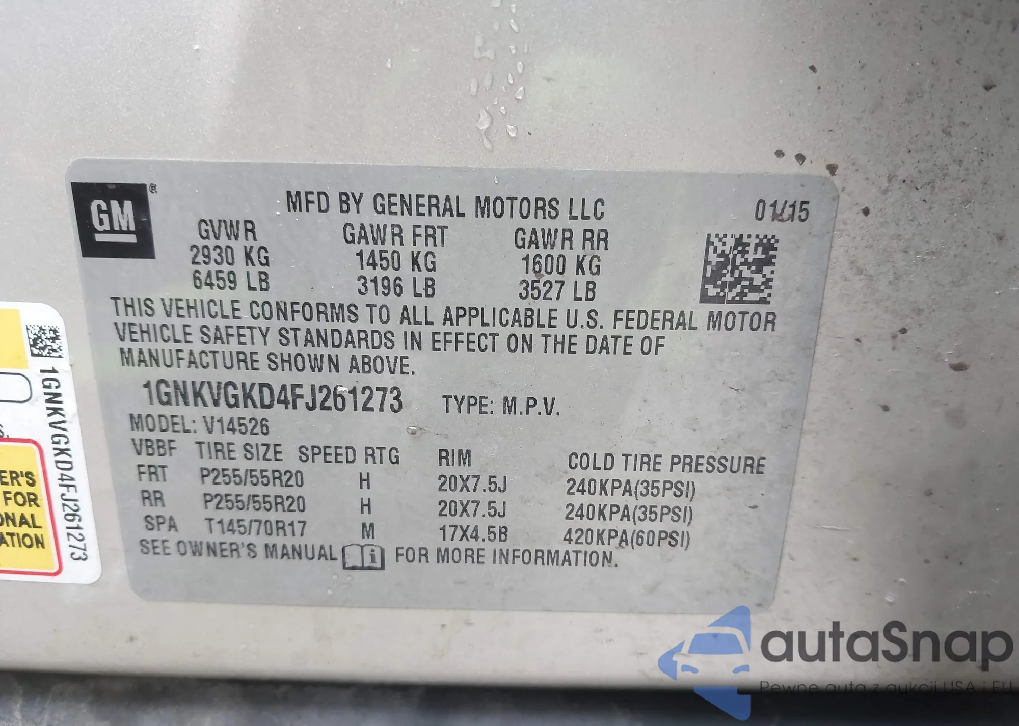 LOT: 43960975 VIN: 1GNKVGKD4FJ261273