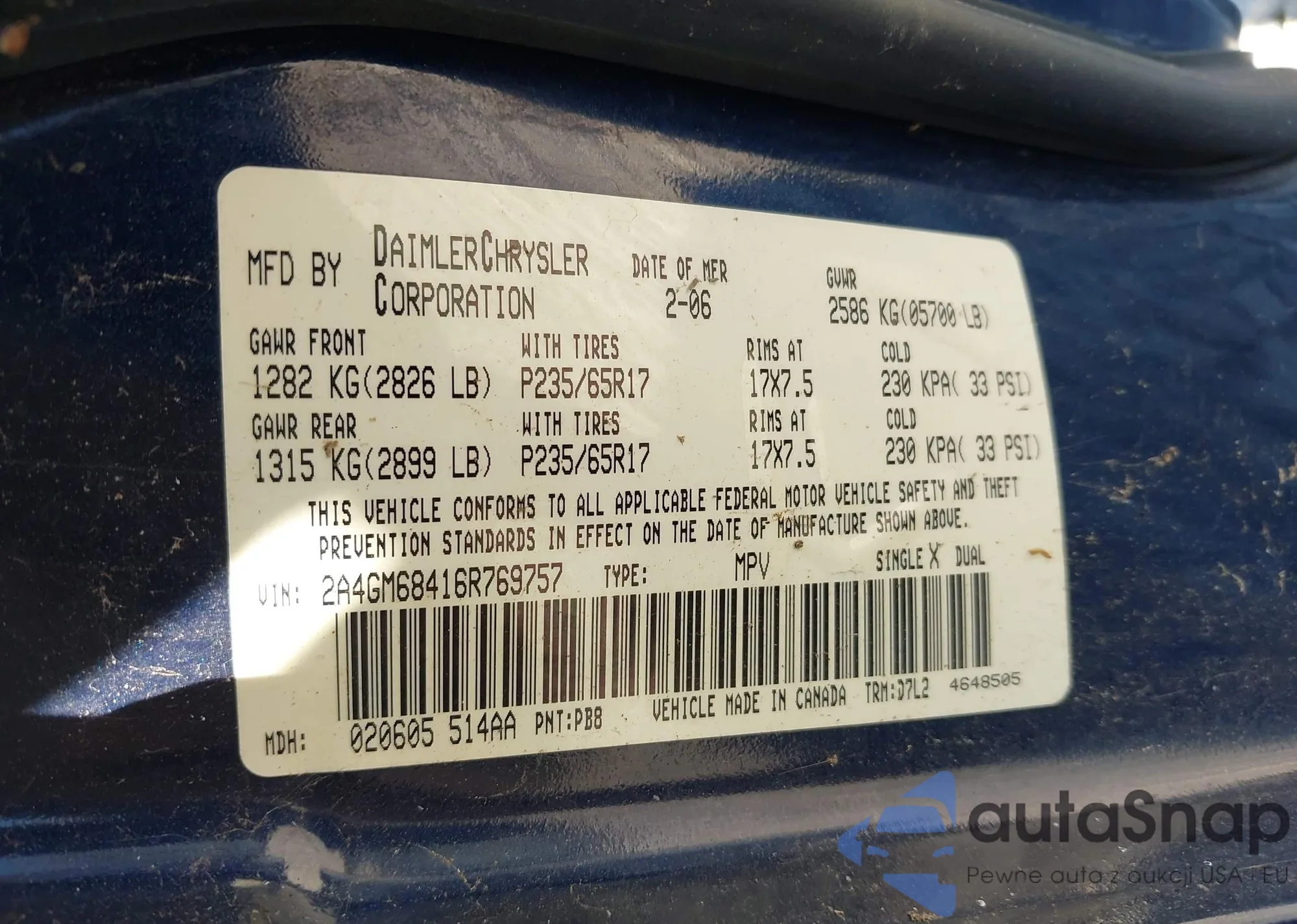 LOT: 43347005 VIN: 2A4GM68416R769757