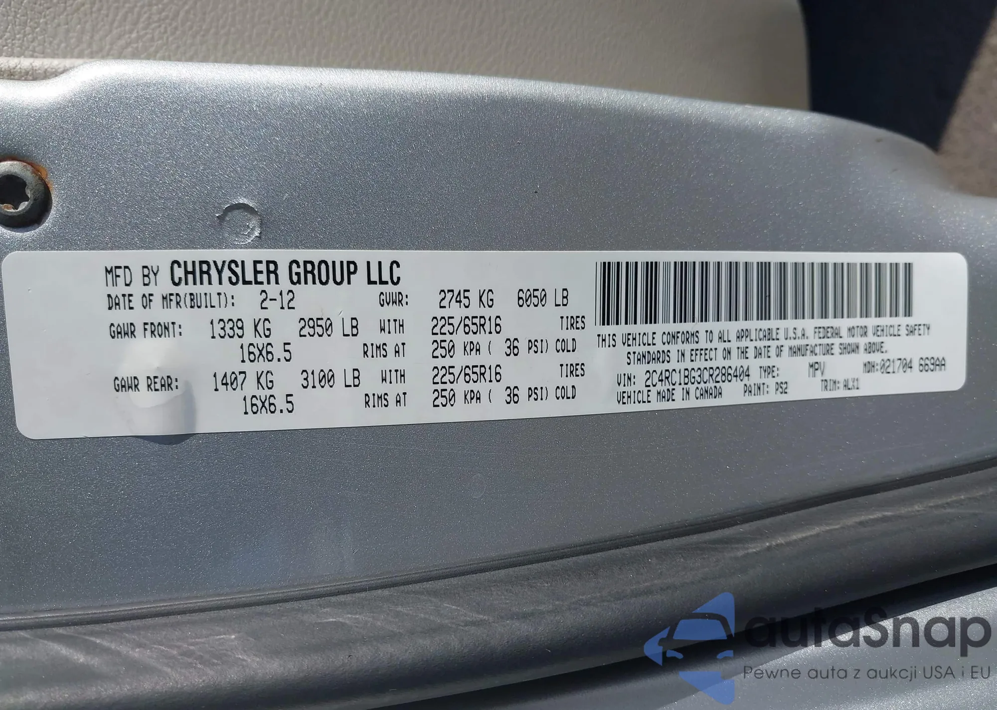 LOT: 42917955 VIN: 2C4RC1BG8CR186802