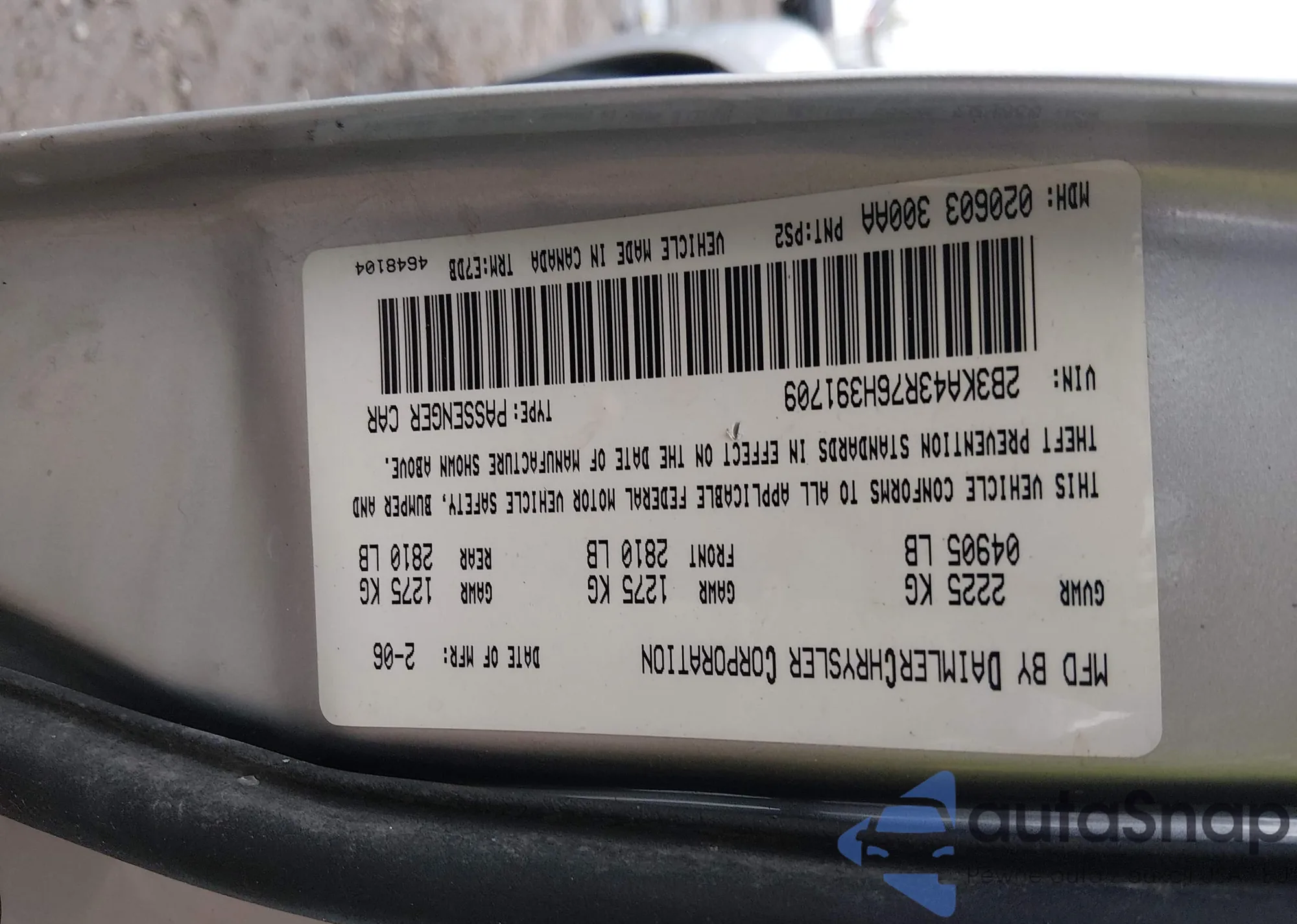 • VIN 2B3KA43R76H391709