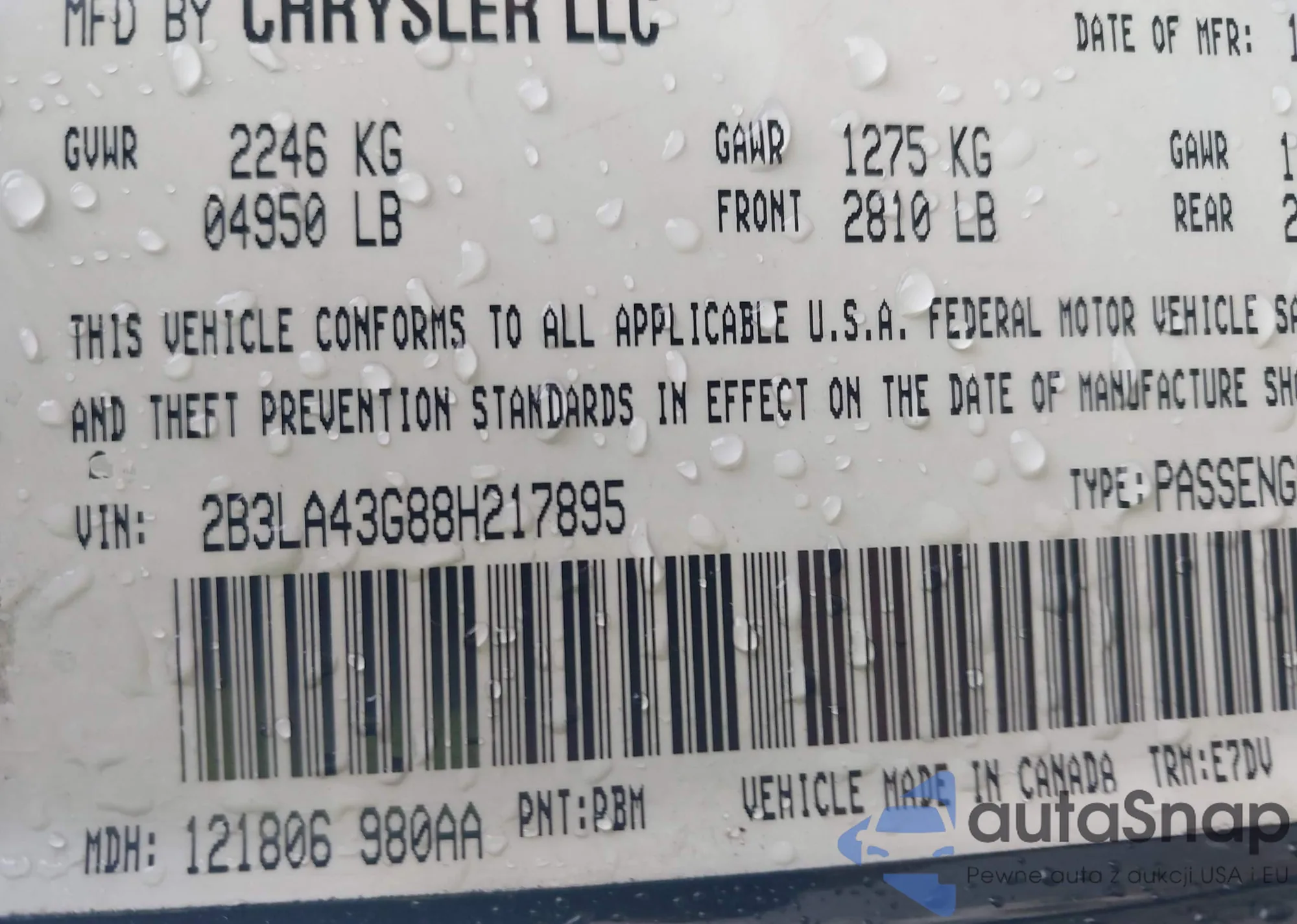 • VIN 2B3KA33G38H243293