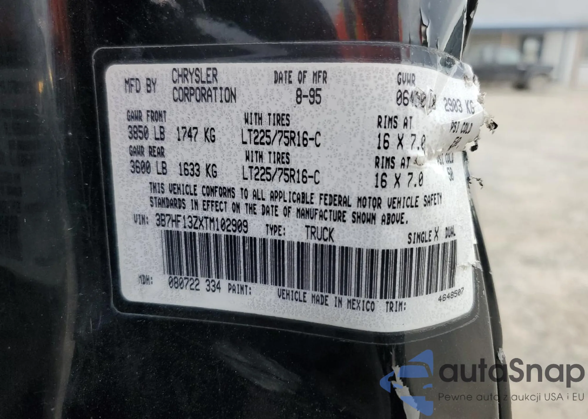 • VIN 3B7HF13ZXTM102909