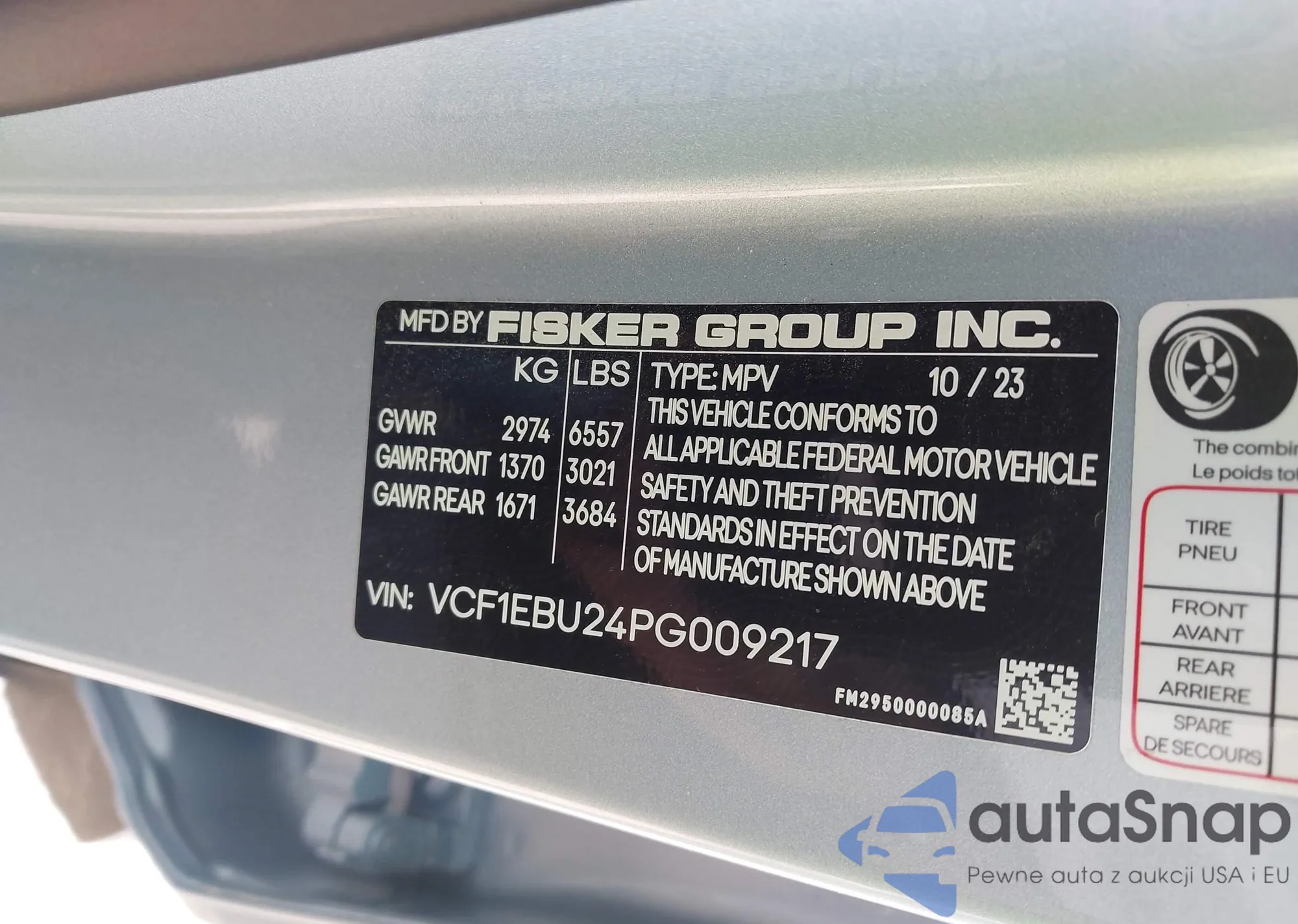2023 Fisker Ocean Sport from USA, damaged, VIN VCF1SAU29PG011323
