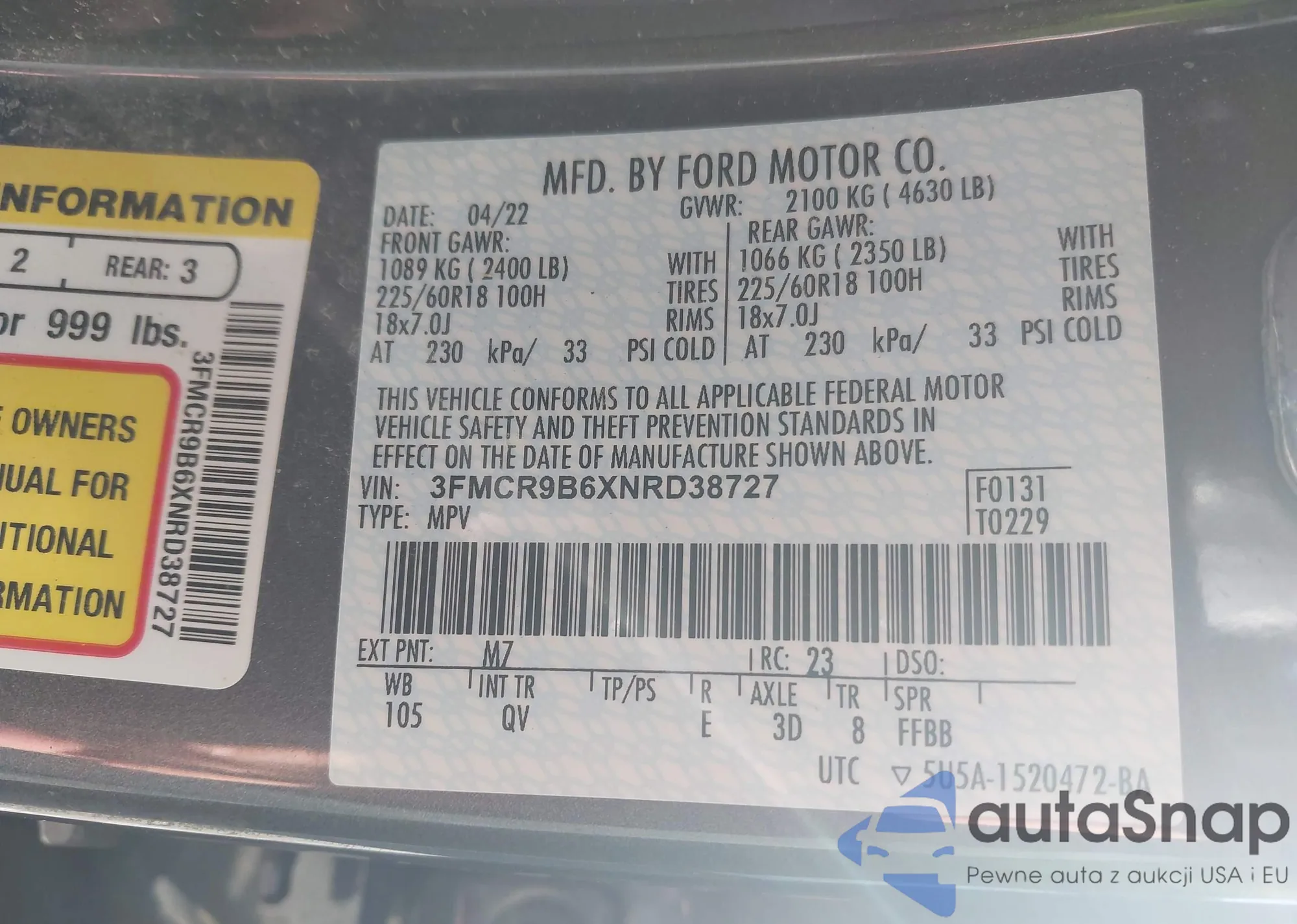 • VIN 3FMCR9B6XNRD38727