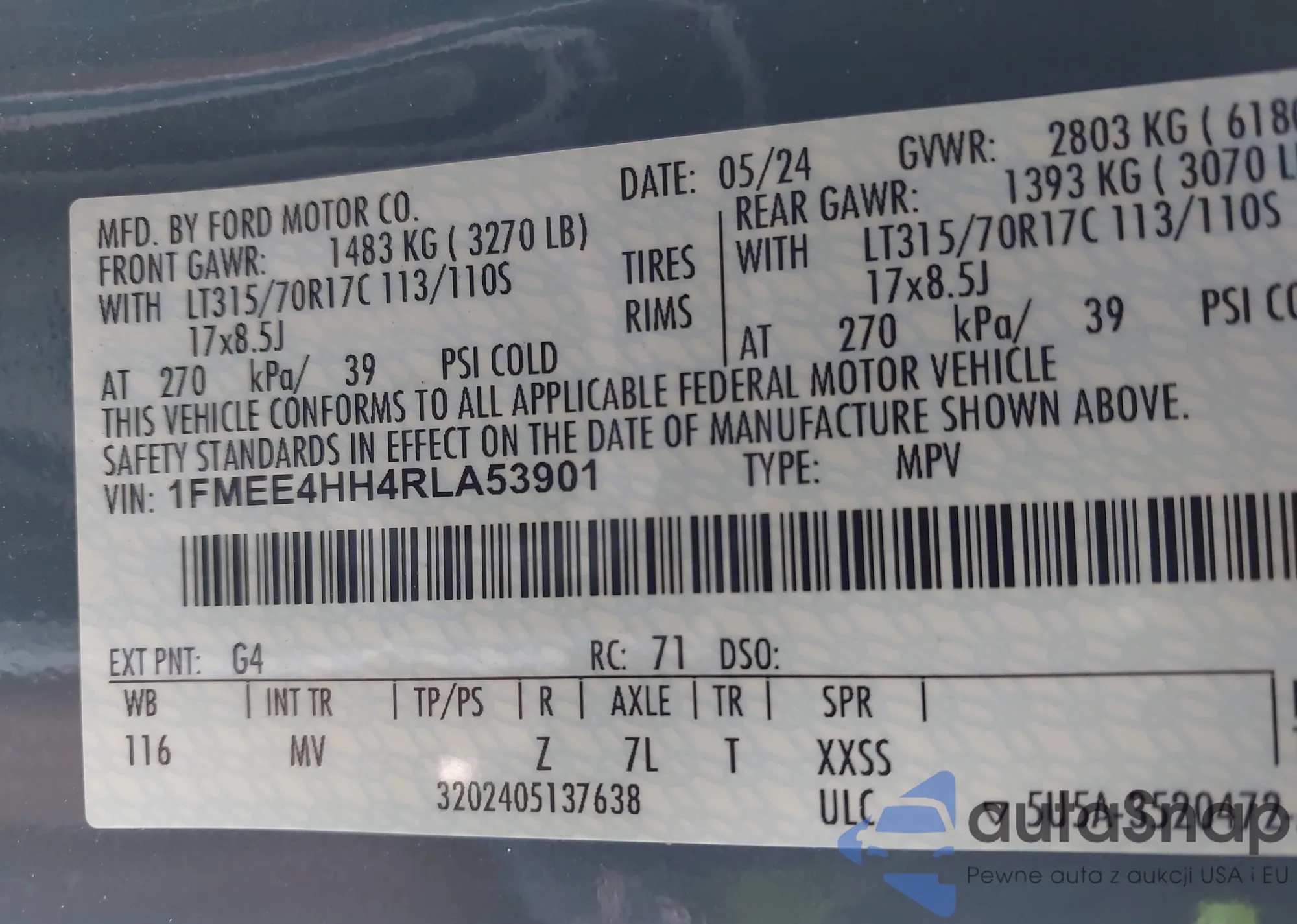 LOT: 44192973 VIN: 1FMEE4HH4RLA53901