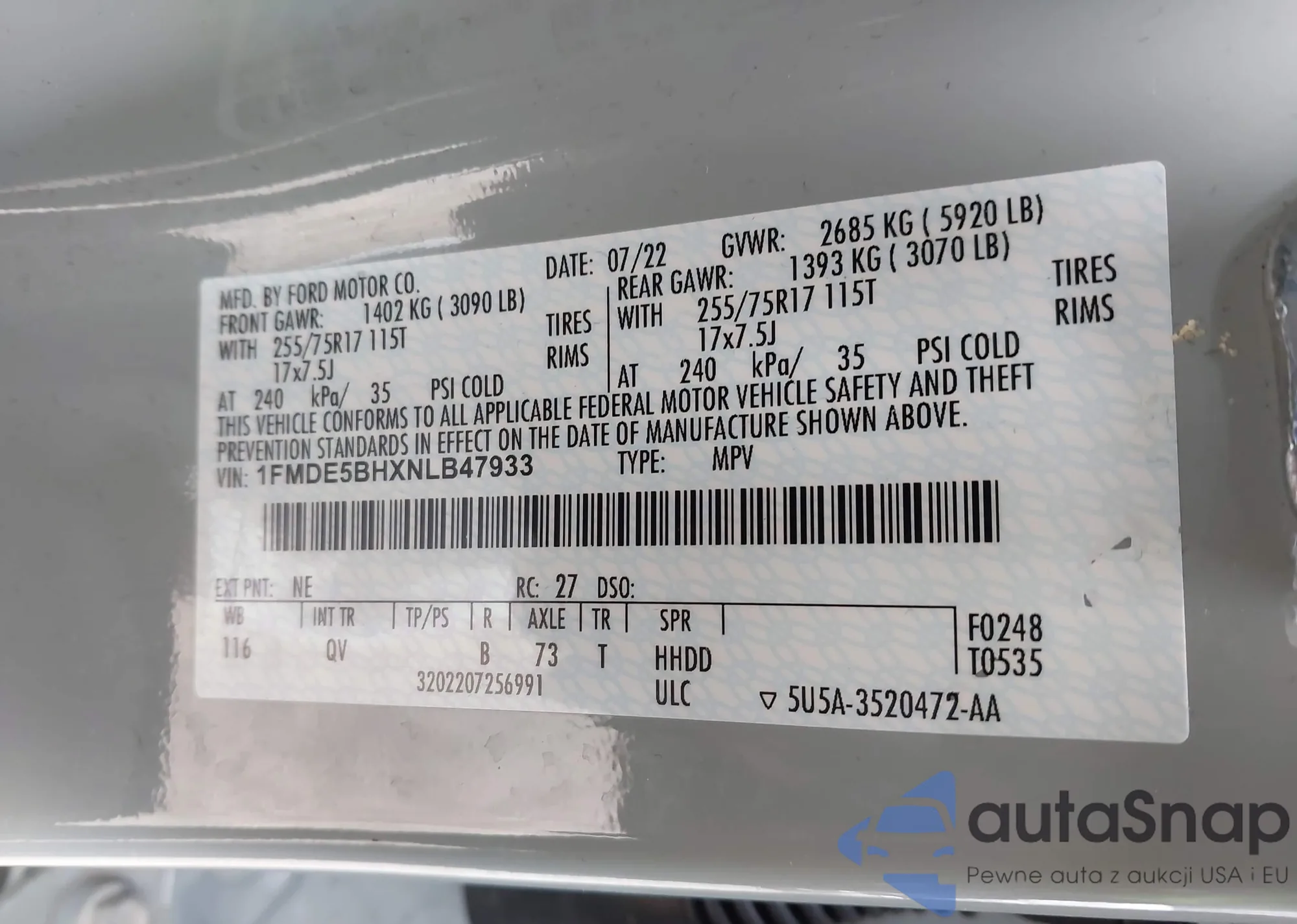 LOT: 44034919 VIN: 1FMDE5DH3NLB79376