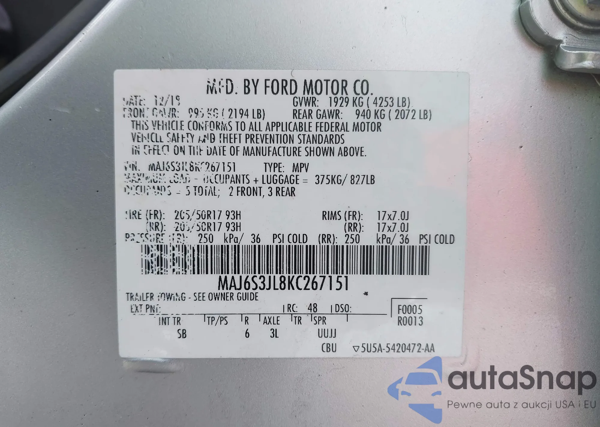 • VIN MAJ6S3JL8KC267151