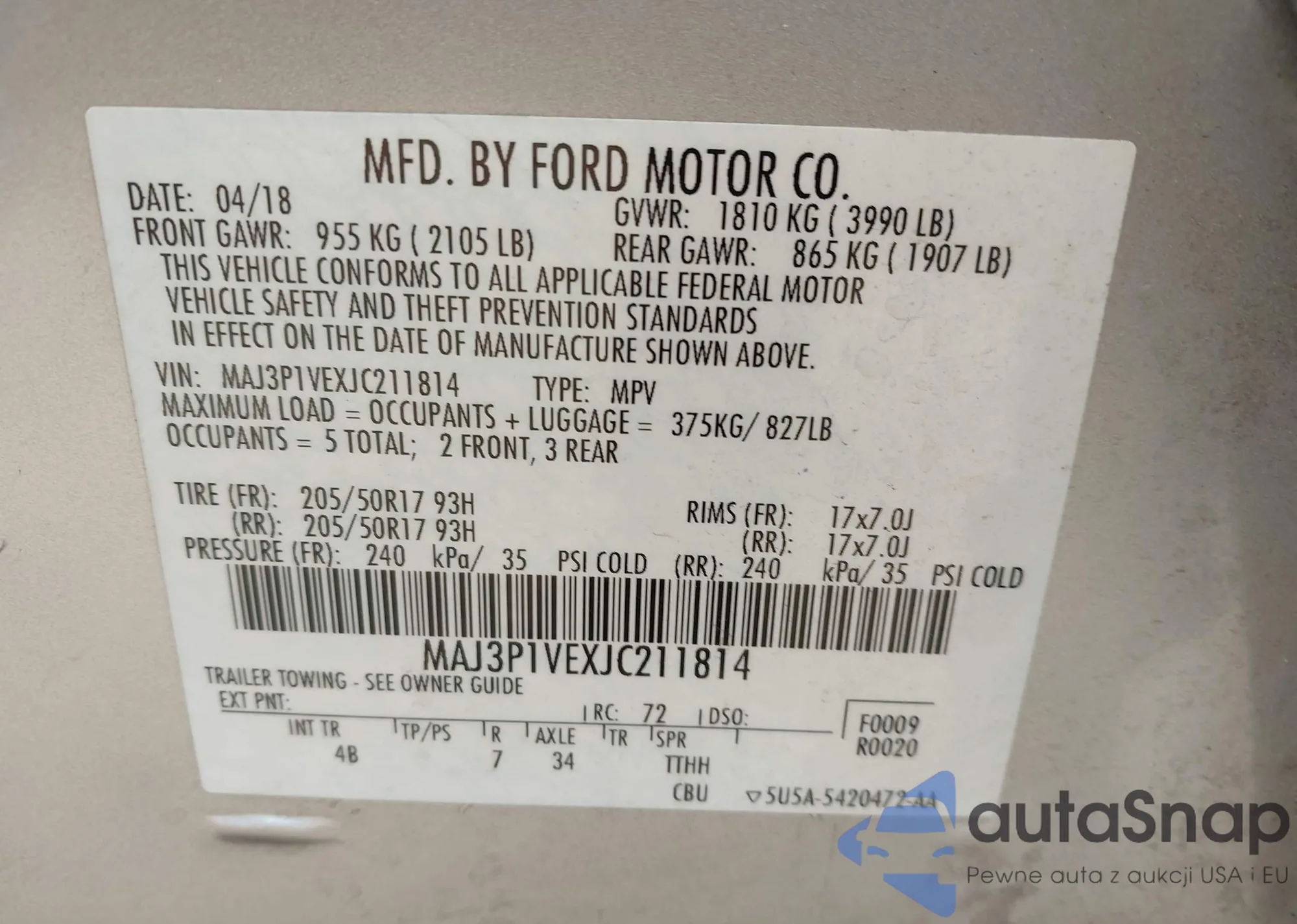 LOT: 44214391 VIN: MAJ3P1VEXJC211814