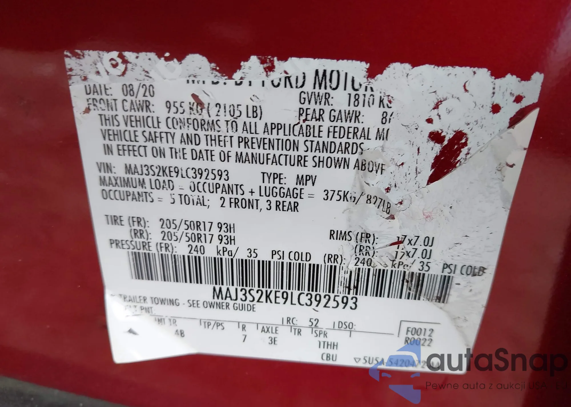 LOT: 44215496 VIN: MAJ3S2KE9LC392593