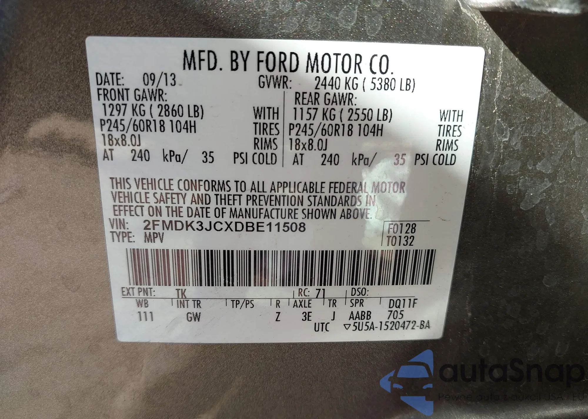 • VIN 2FMDK3JCXDBE11508