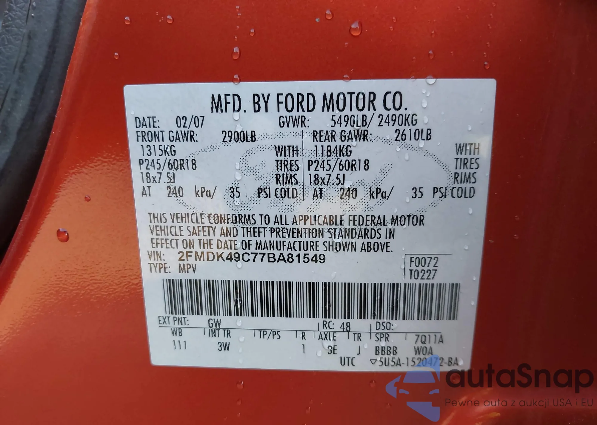 LOT: 44174738 VIN: 2FMDK49C77BA81549