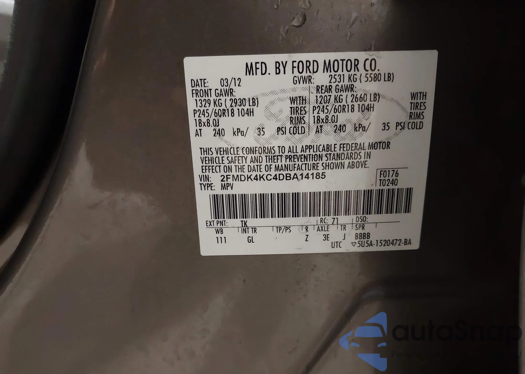 LOT: 44322367 VIN: 2FMDK4KC4DBA14185