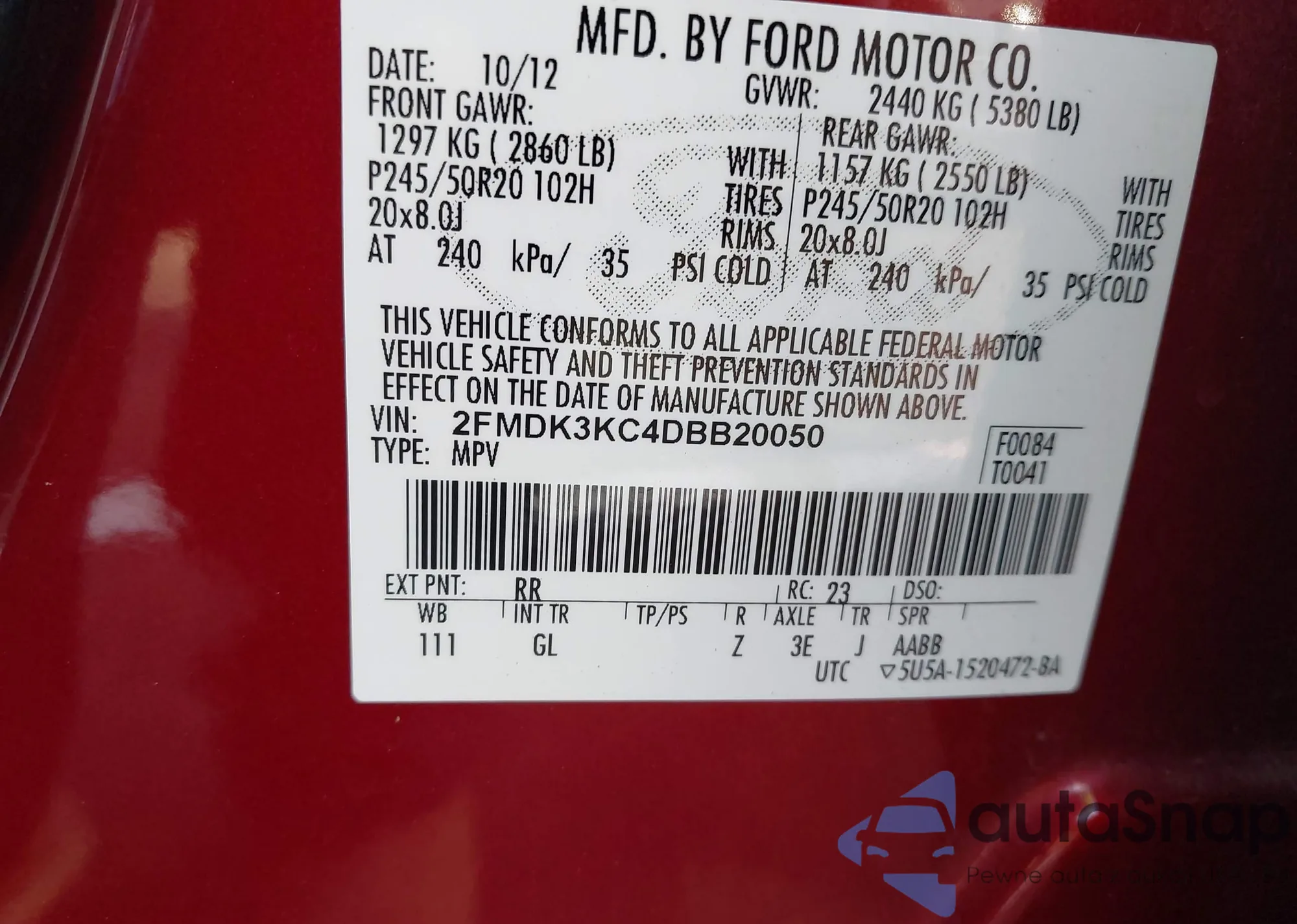 LOT: 43751004 VIN: 2FMDK3AK9CBA12949