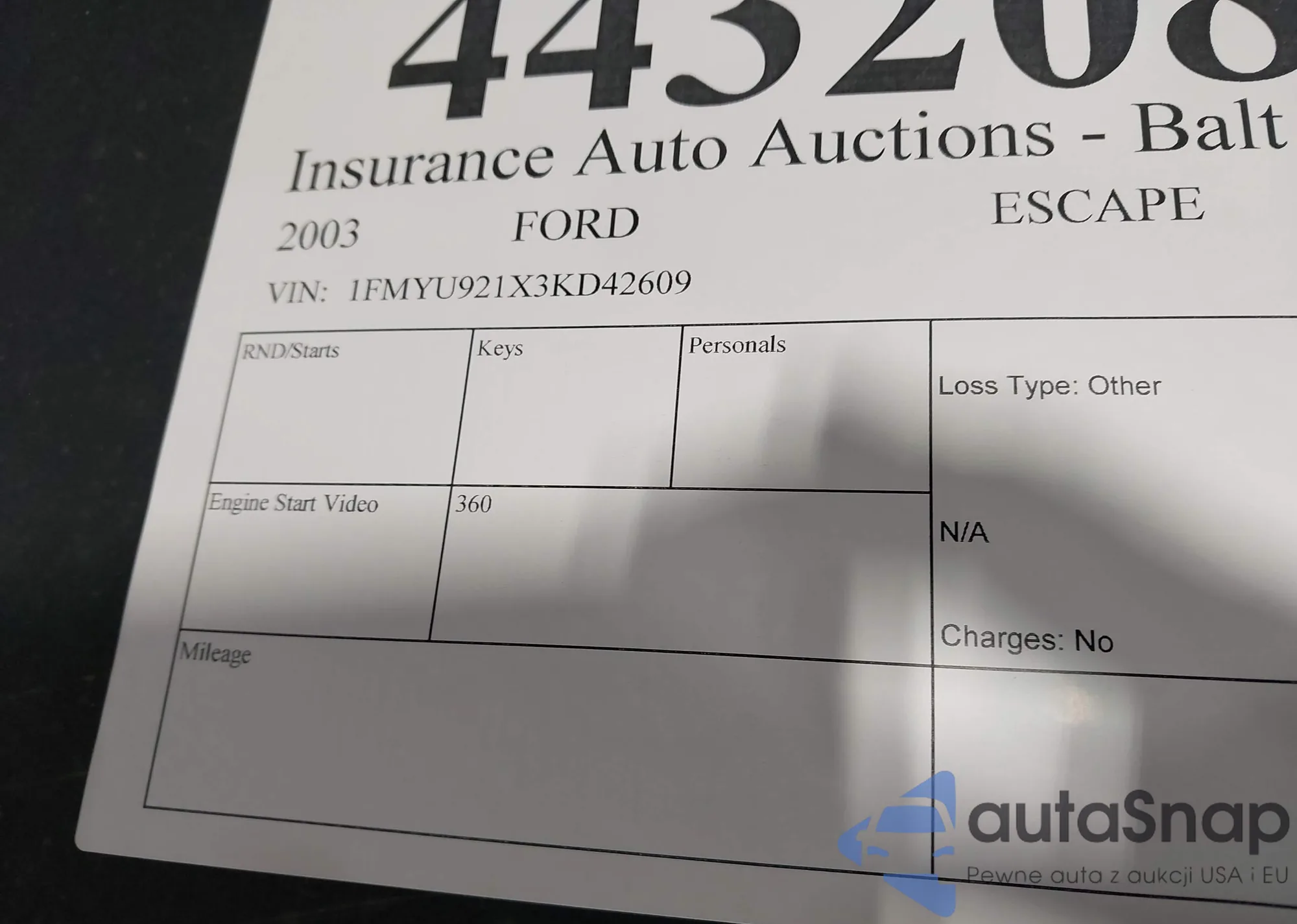LOT: 44222909 VIN: 1FMYU93123KC46309