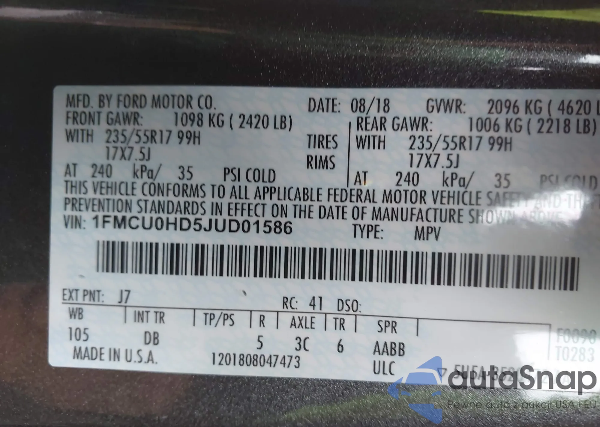 LOT: 43656161 VIN: 1FMCU0F78JUA41861