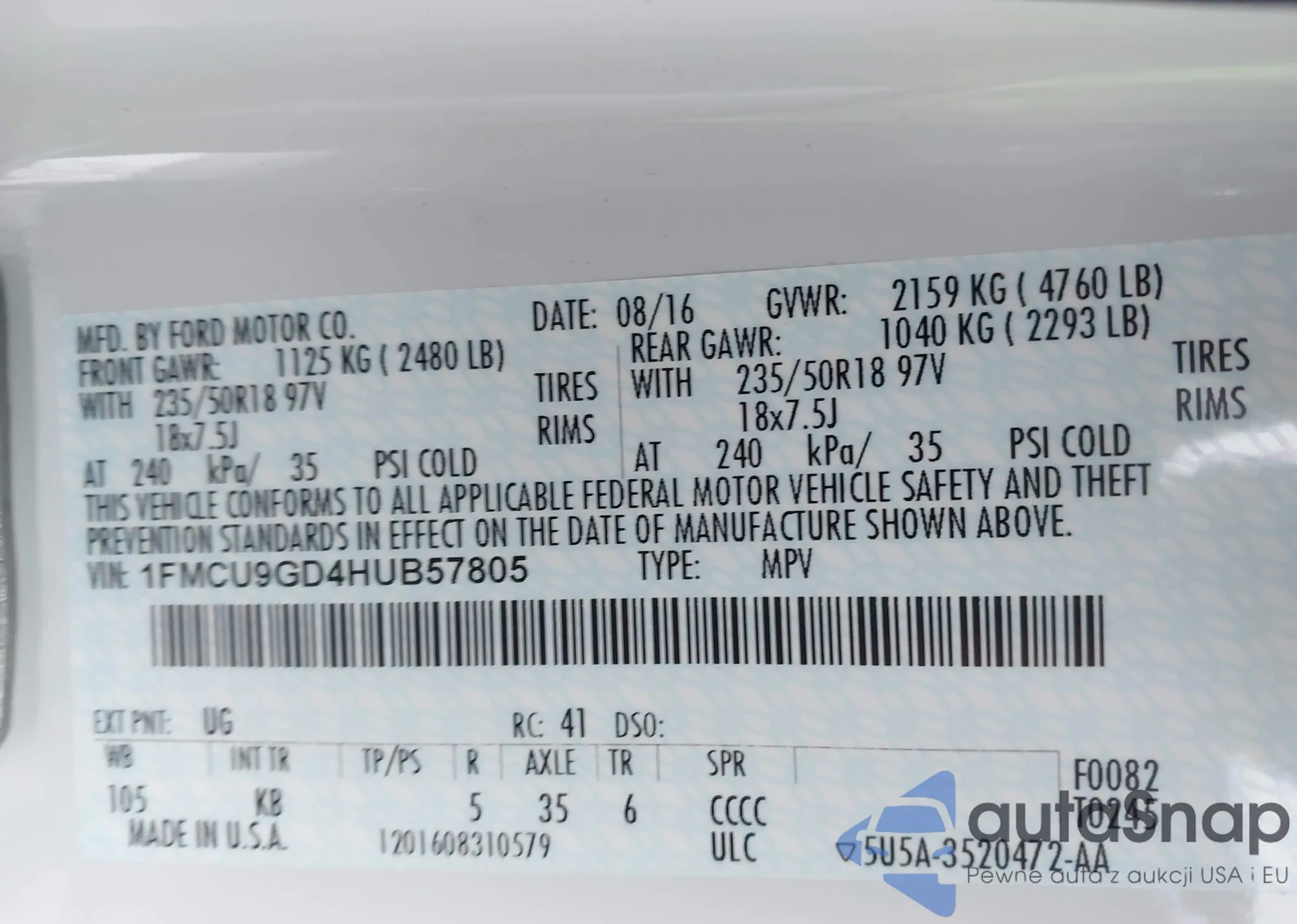 • VIN 1FMCU9GD4HUB57805