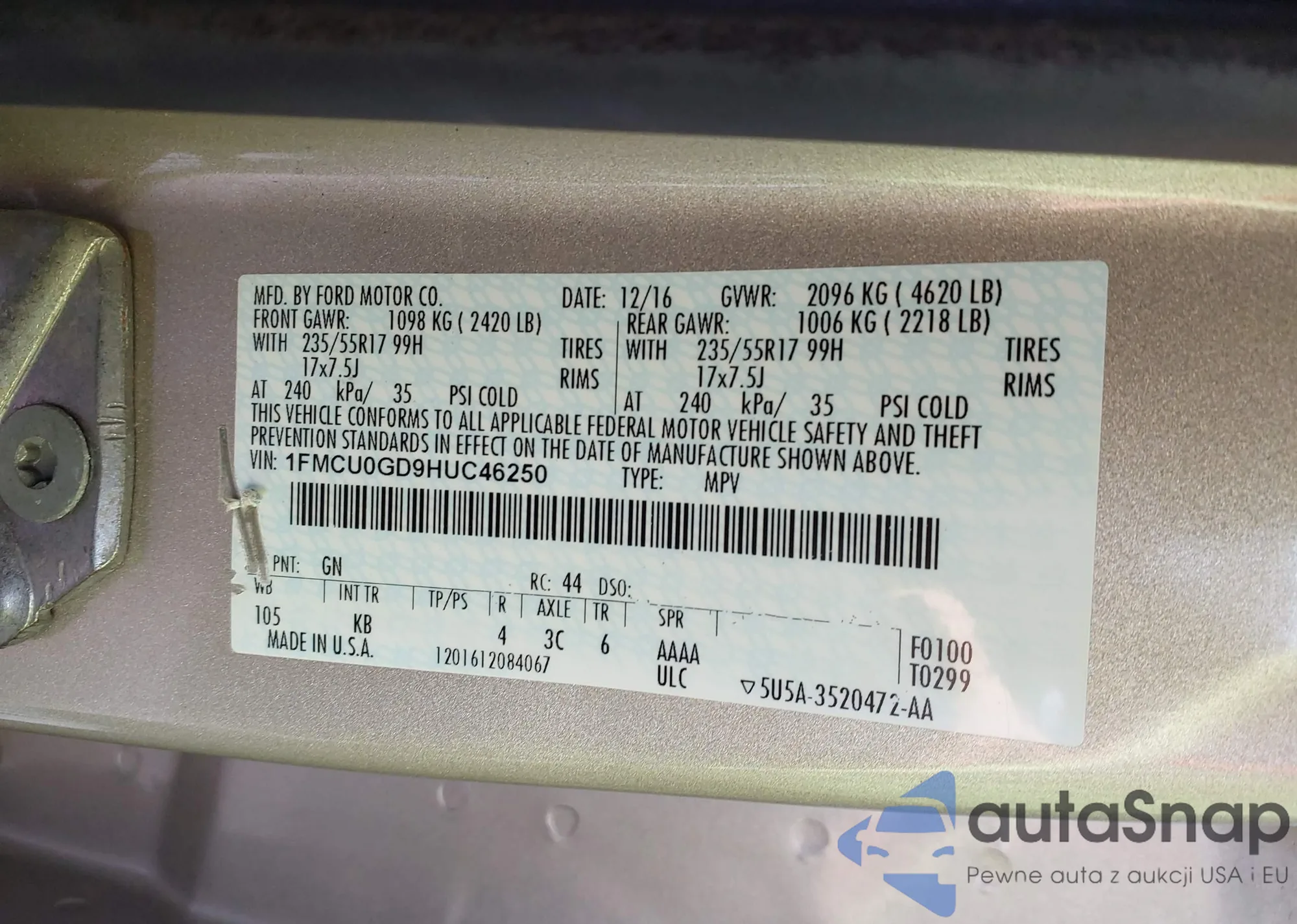 • VIN 1FMCU0GD9HUC46250