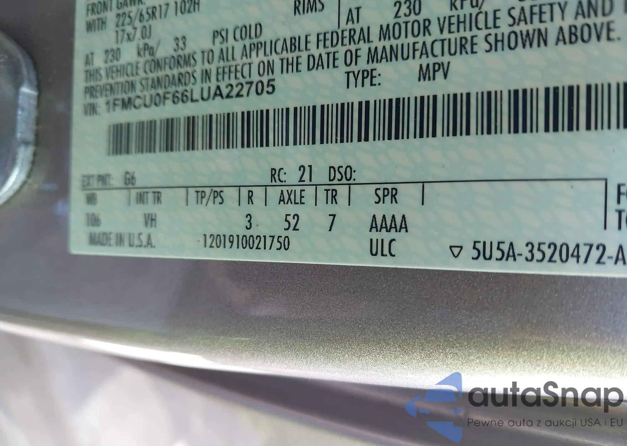 LOT: 43700120 VIN: 1FMCU0F66LUA22705