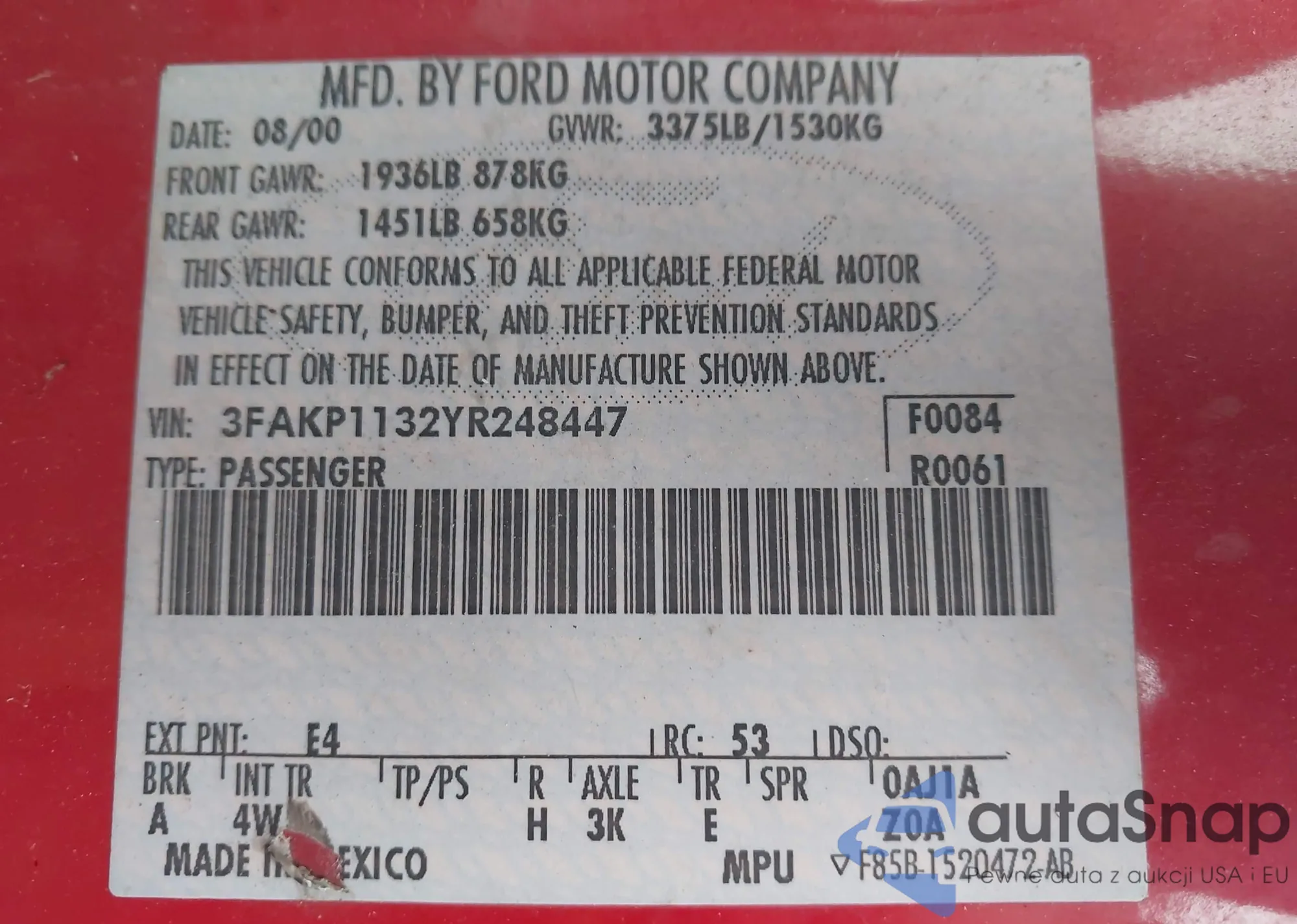 • VIN 3FAKP1132YR248447