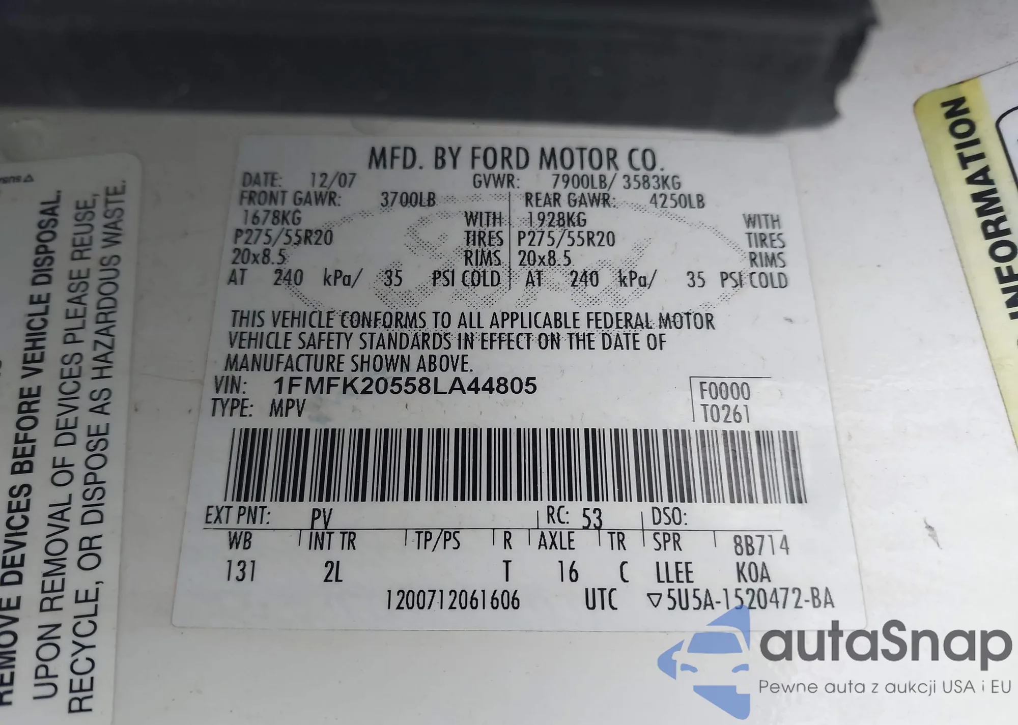 LOT: 43814199 VIN: 1FMFK20558LA44805