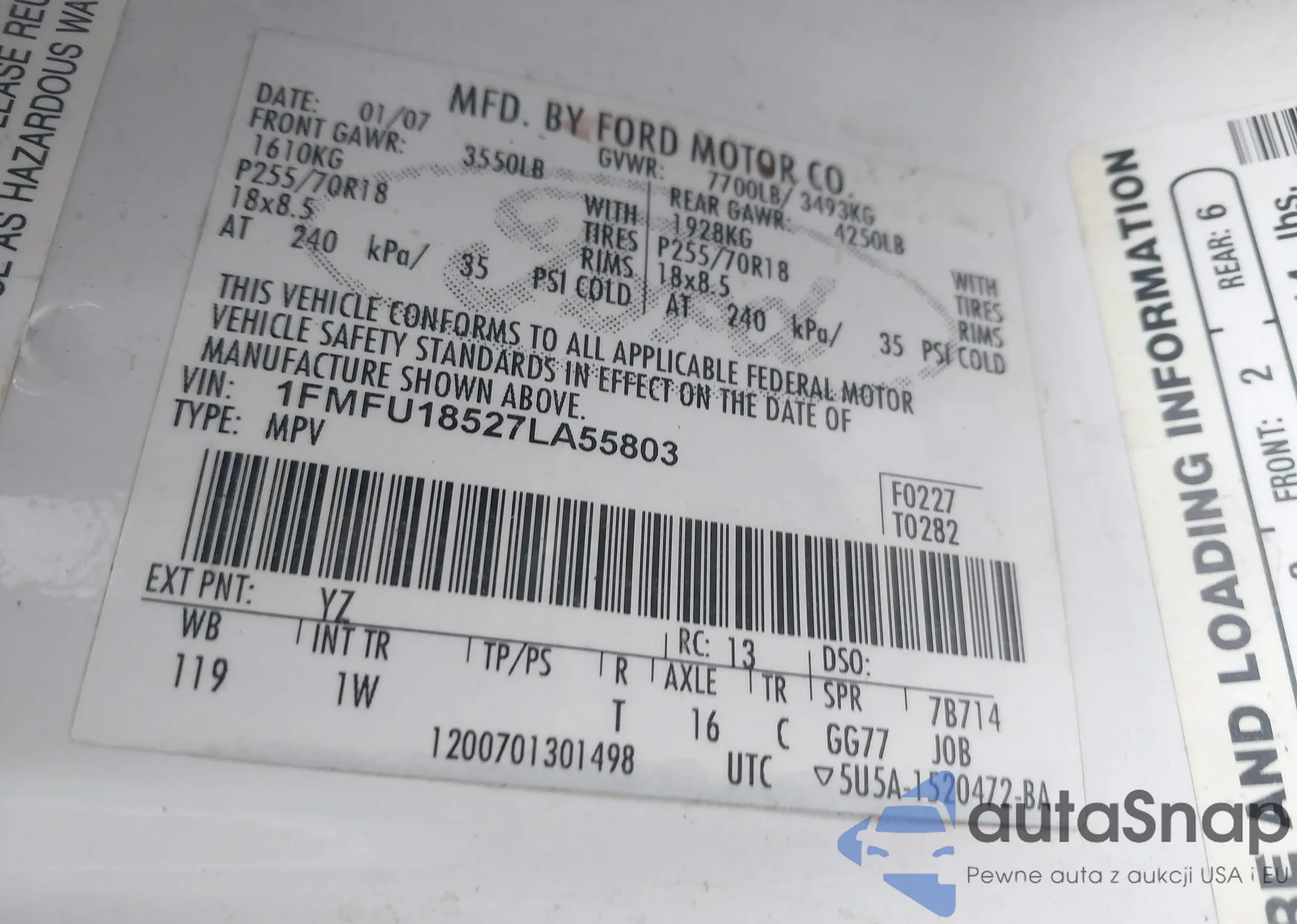 LOT: 43863178 VIN: 1FMFU18527LA55803