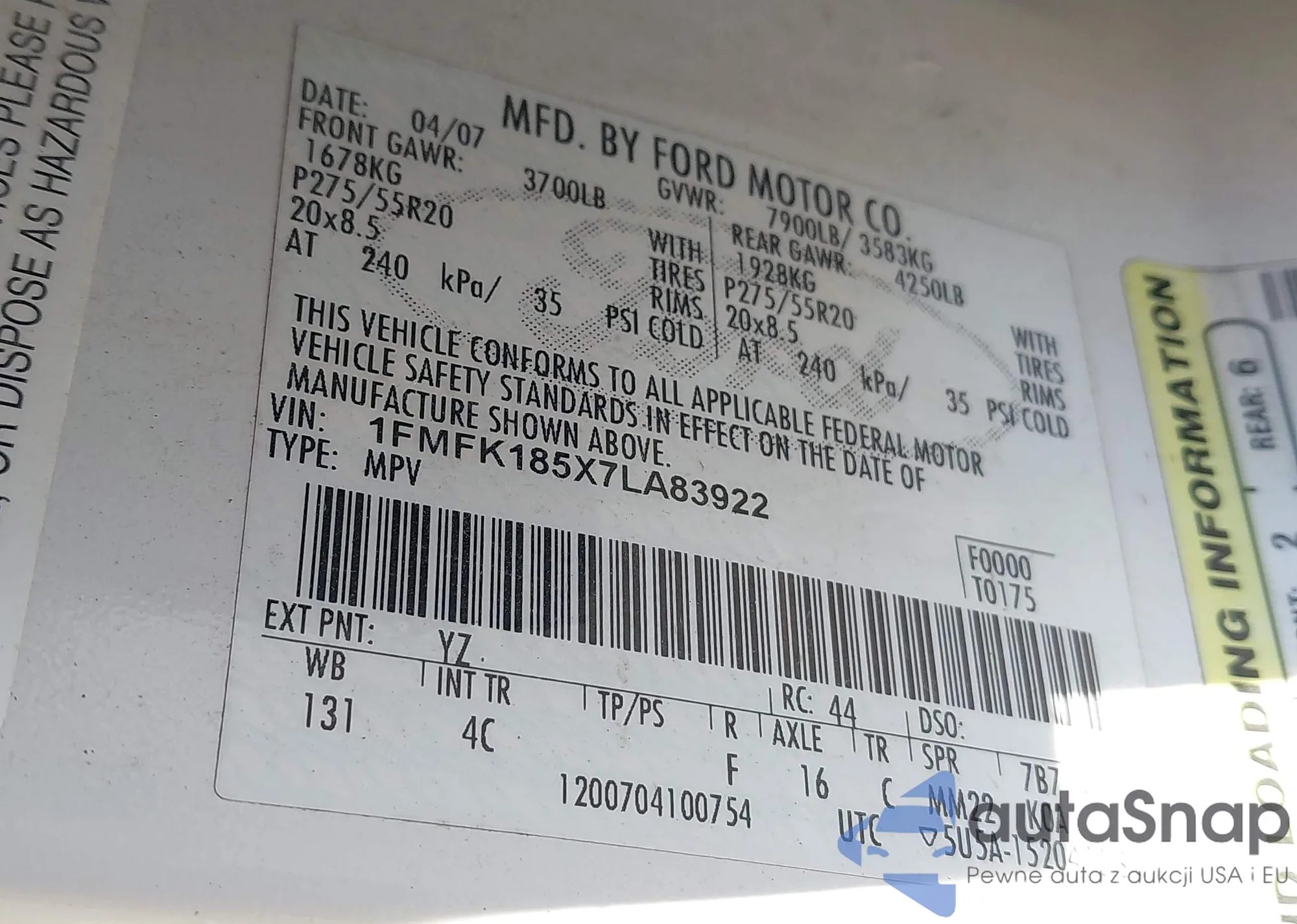 • VIN 1FMFK185X7LA83922