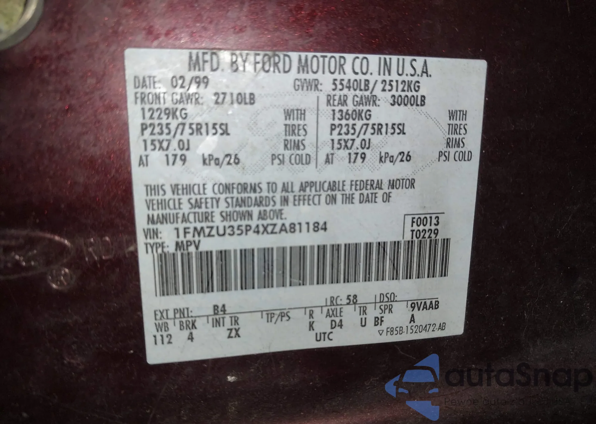 • VIN 1FMDU35P4XZA81184