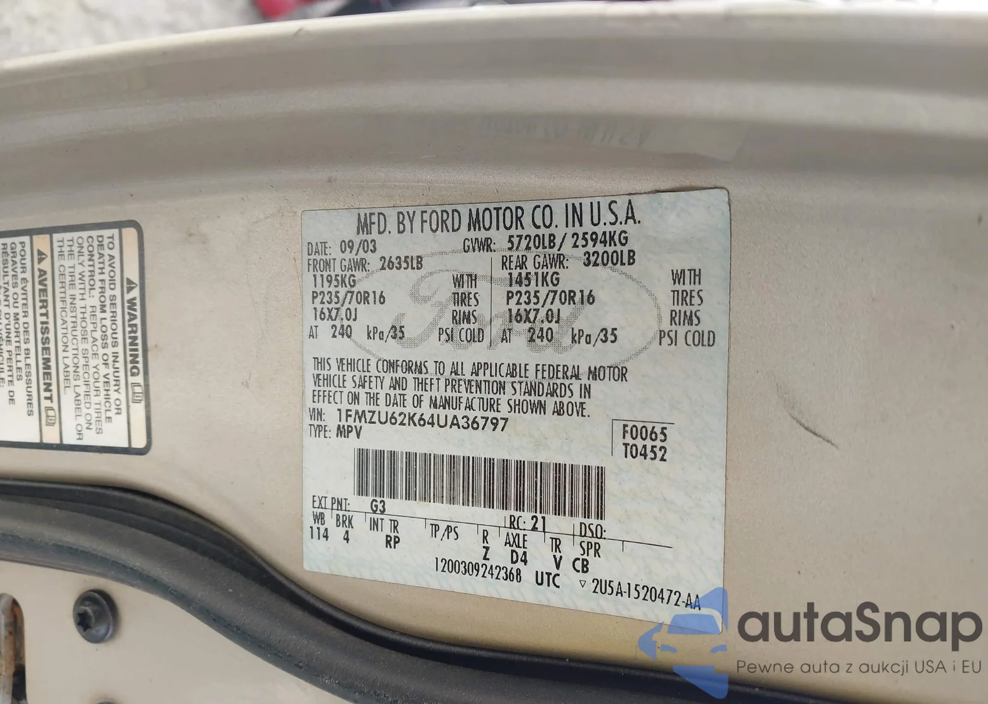 • VIN 1FMZU62K64UA36797