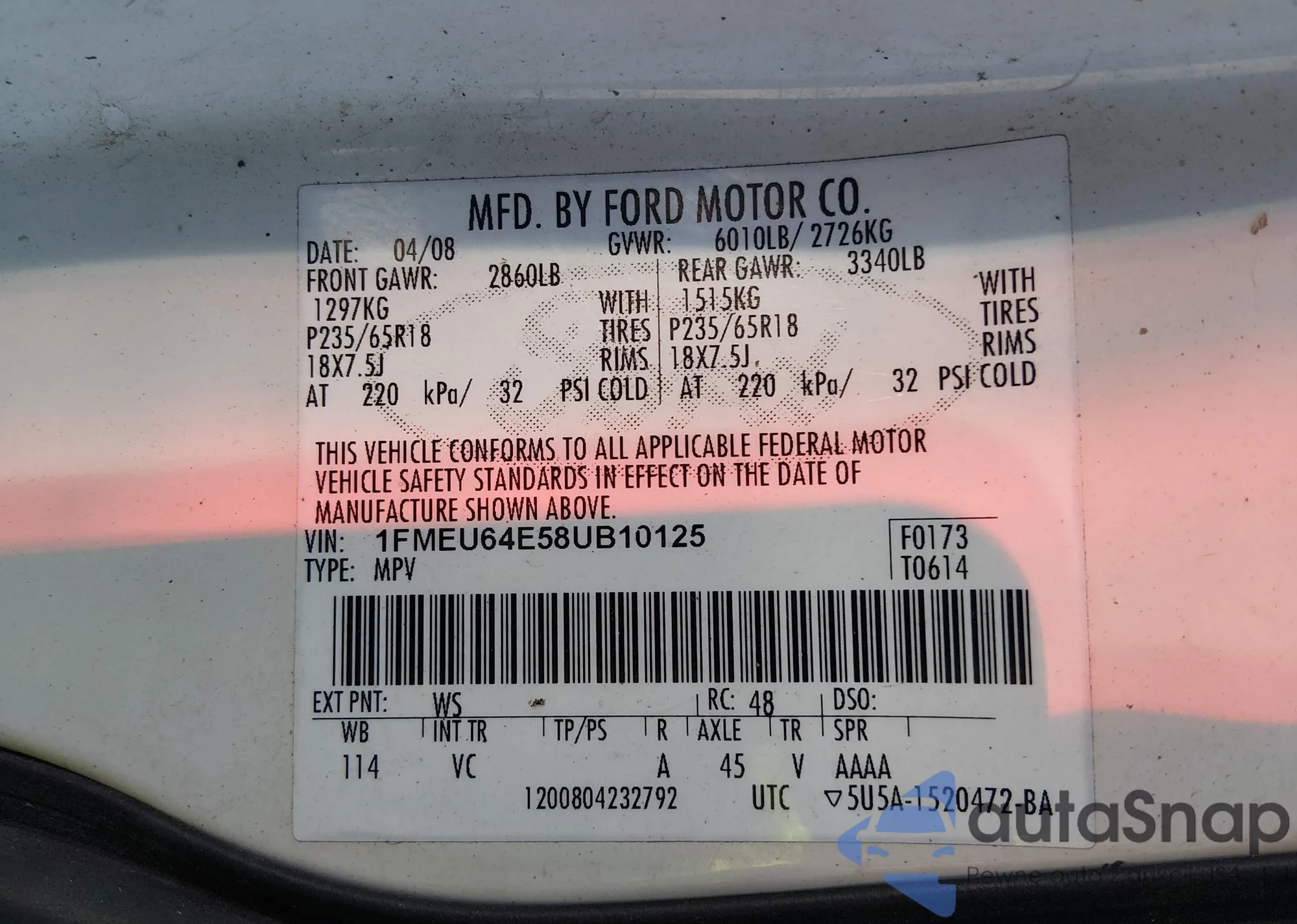 • VIN 1FMEU64E58UB10125