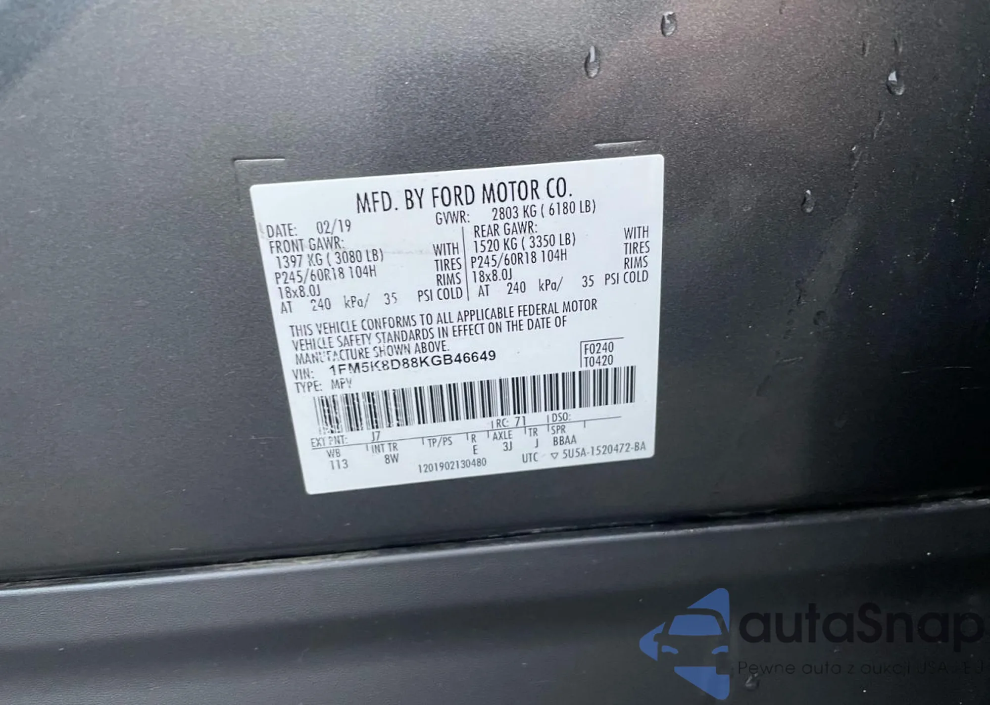 LOT: 72871785 VIN: 1FM5K8D88KGB46649