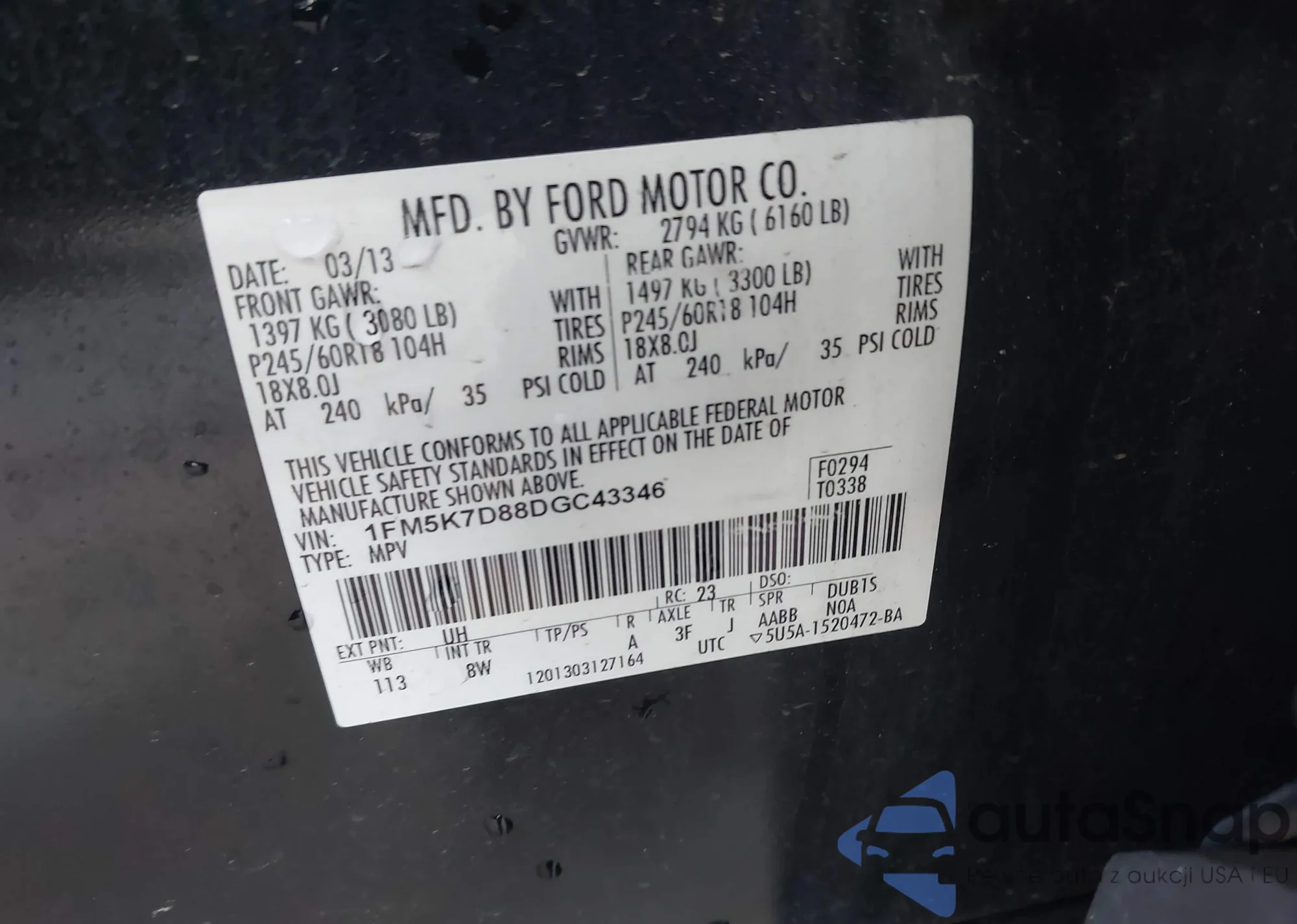 LOT: 44161440 VIN: 1FM5K7D88DGC43346
