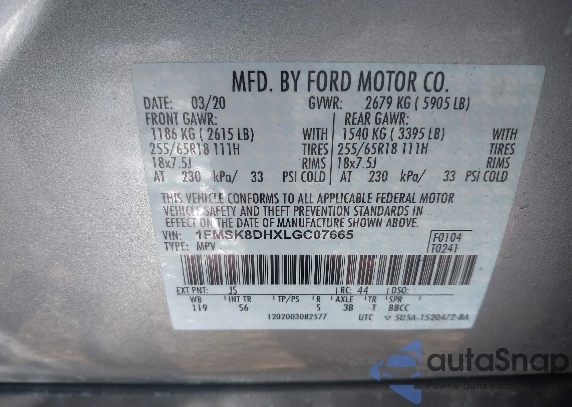 LOT: 44362659 VIN: 1FMSK8DHXLGC07665