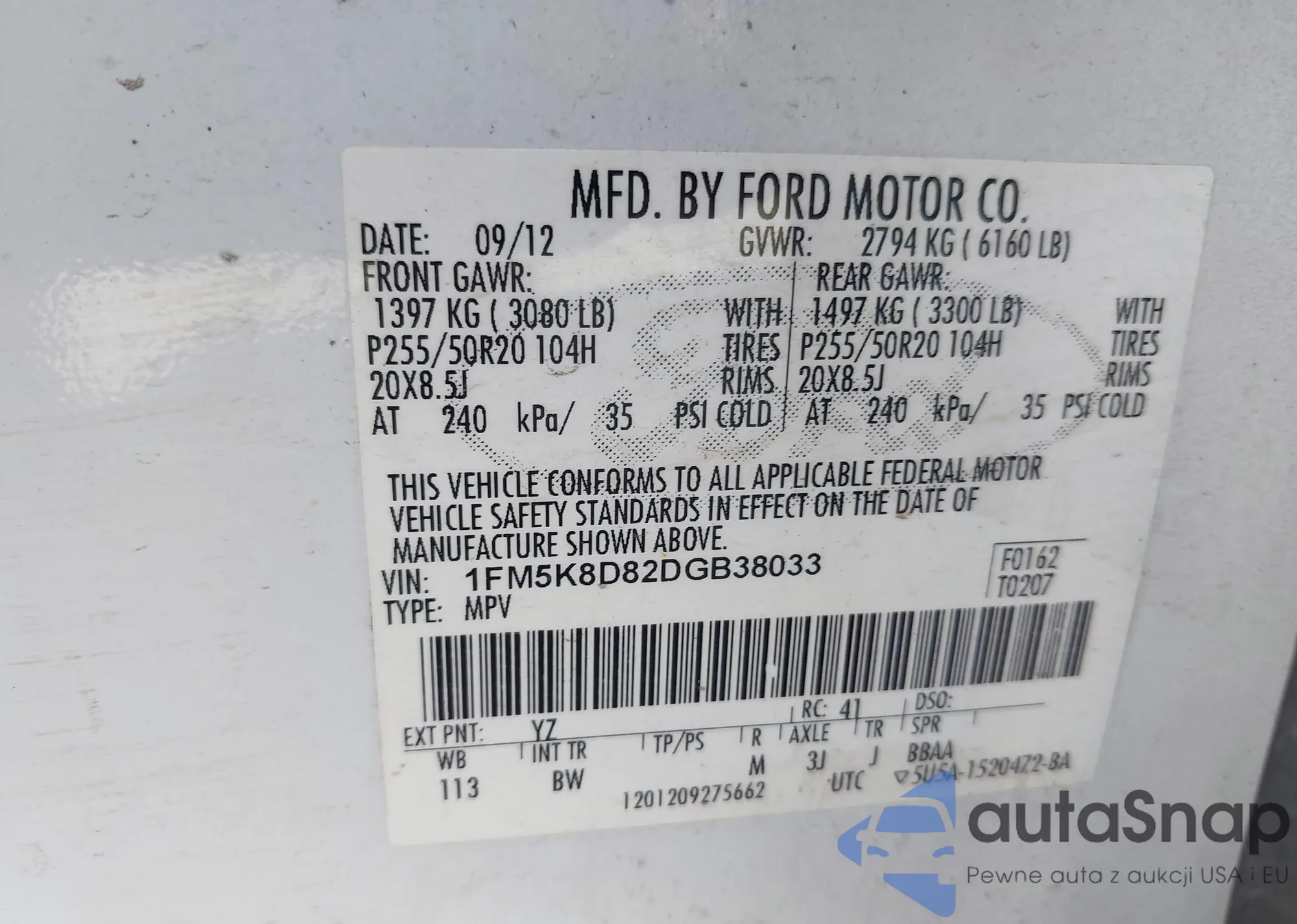 LOT: 43191079 VIN: 1FM5K8D82DGB38033