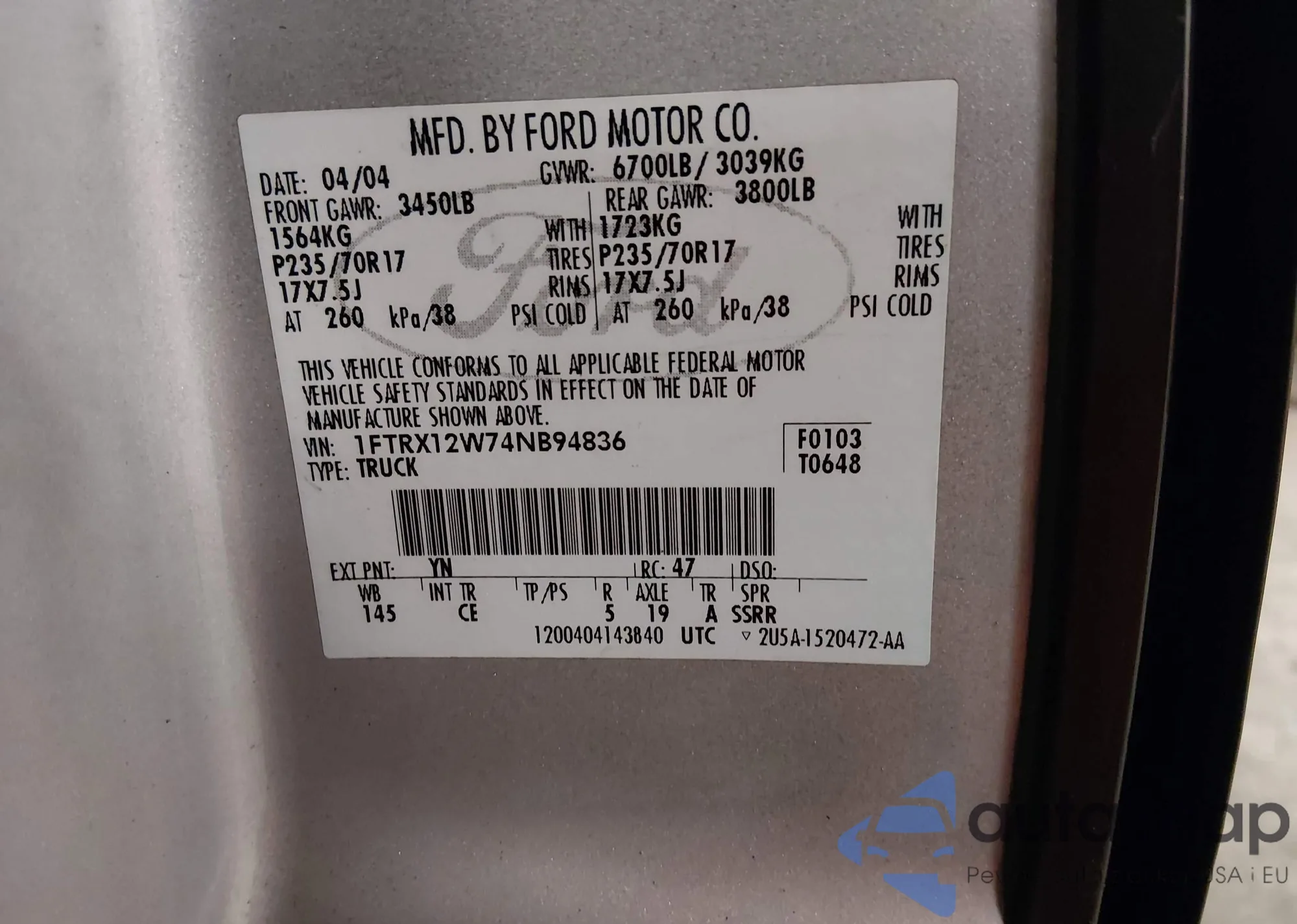 • VIN 1FTRX12W74NB94836