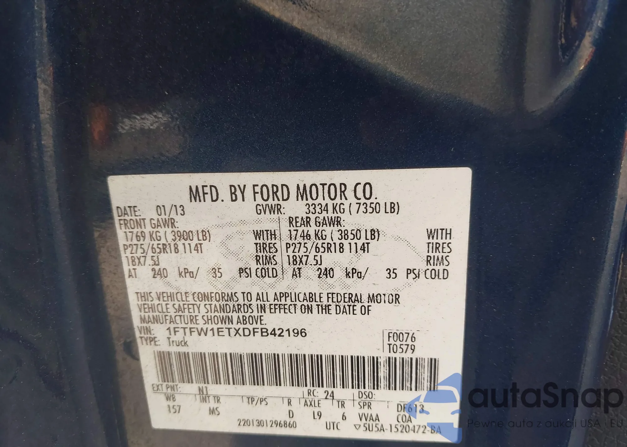 • VIN 1FTFW1ETXDFB42196