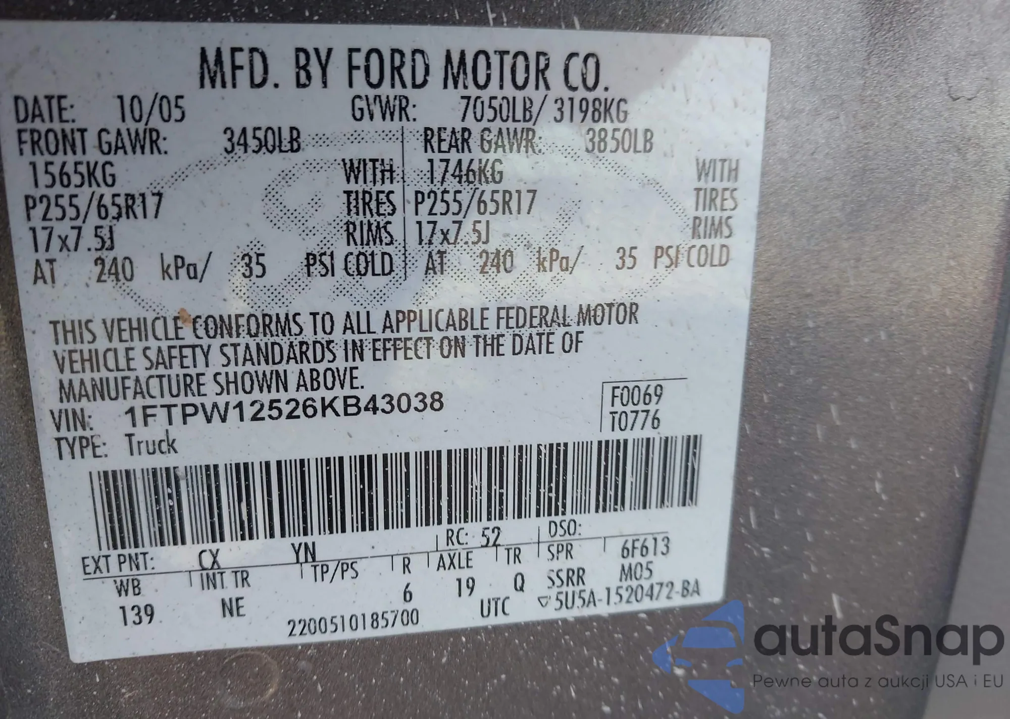 • VIN 1FTPW12526KB43038