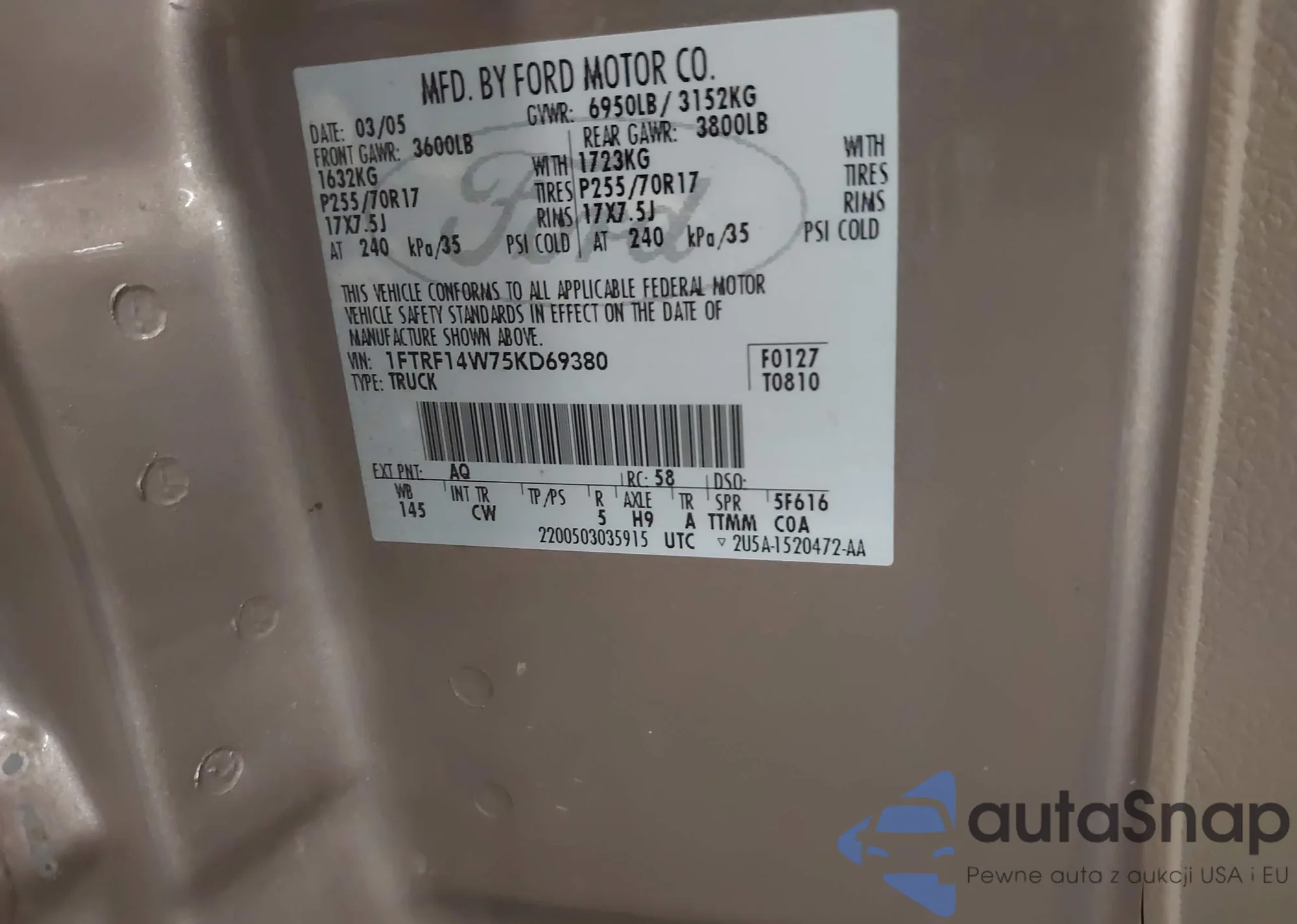 • VIN 1FTRF14W75KD69380