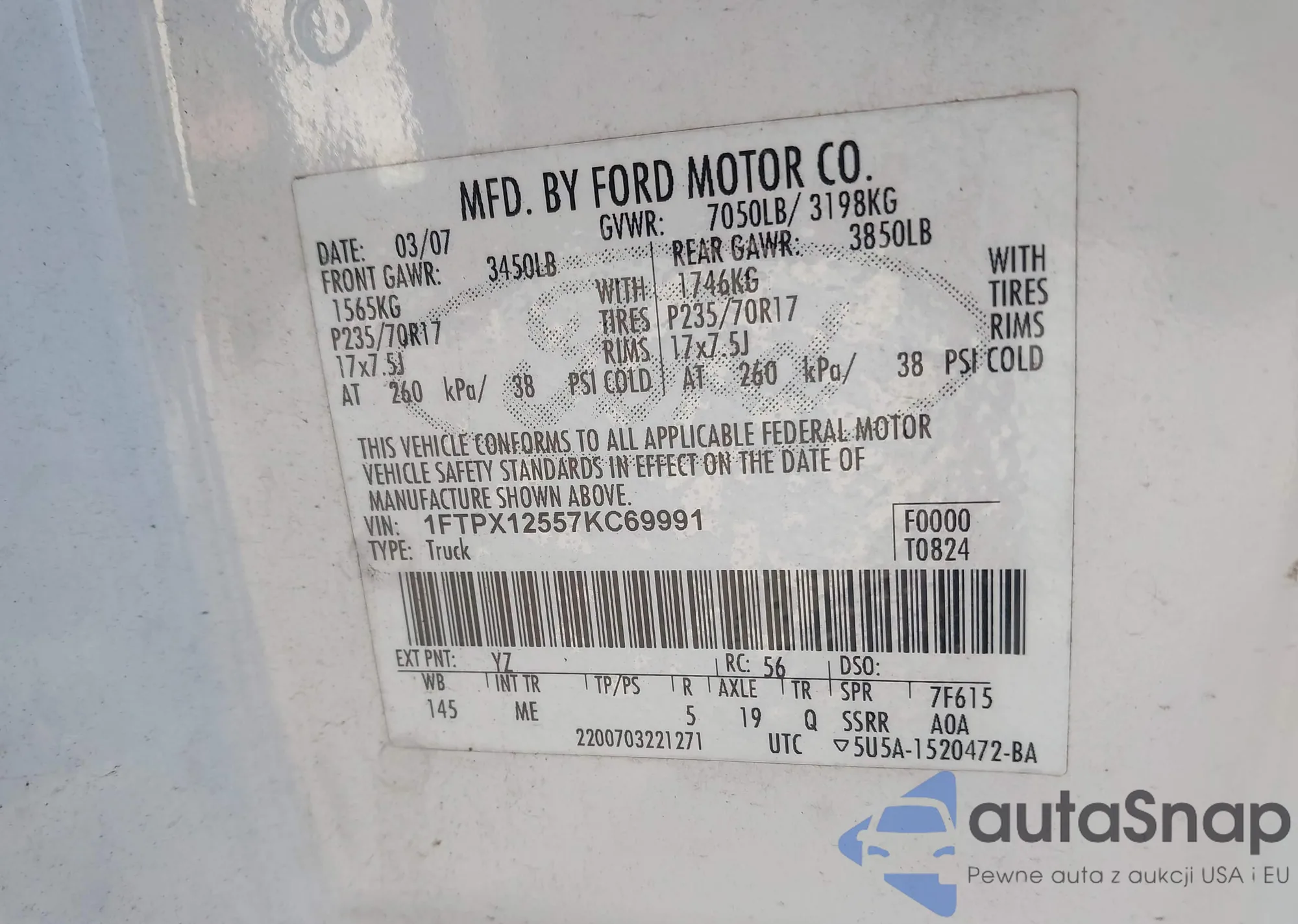 LOT: 44131034 VIN: 1FTPX12557KC69991