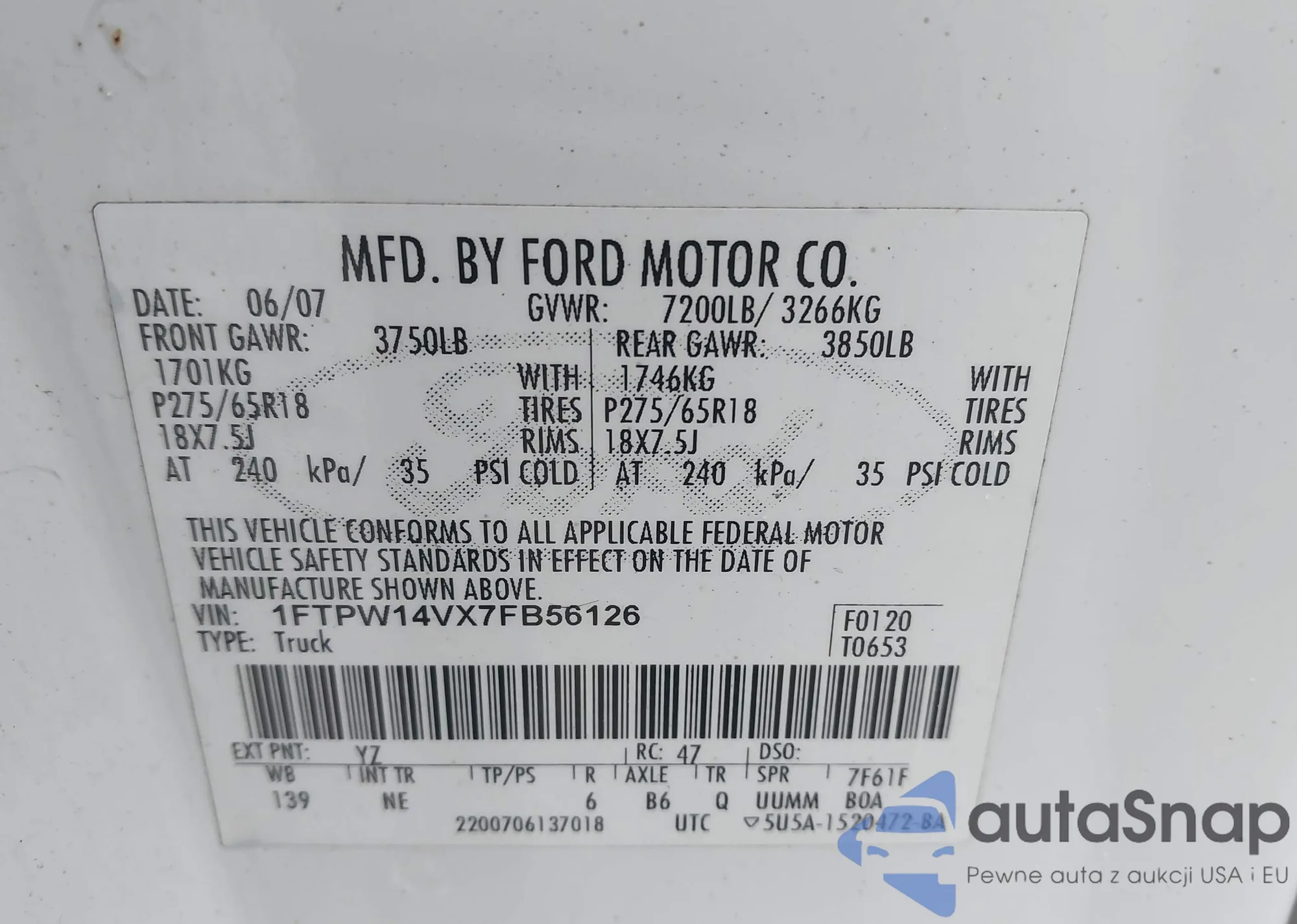 LOT: 44143634 VIN: 1FTPW14V67FA15814