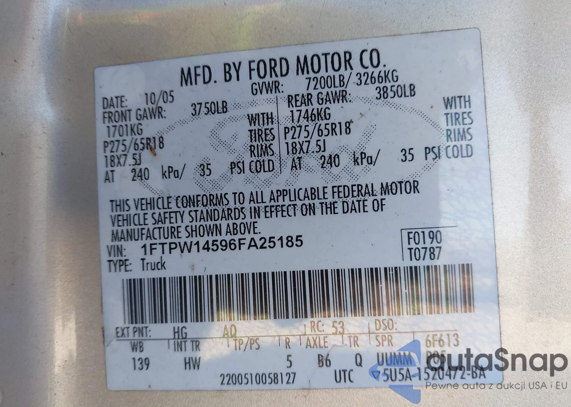 LOT: 44188113 VIN: 1FTPW14596FA25185