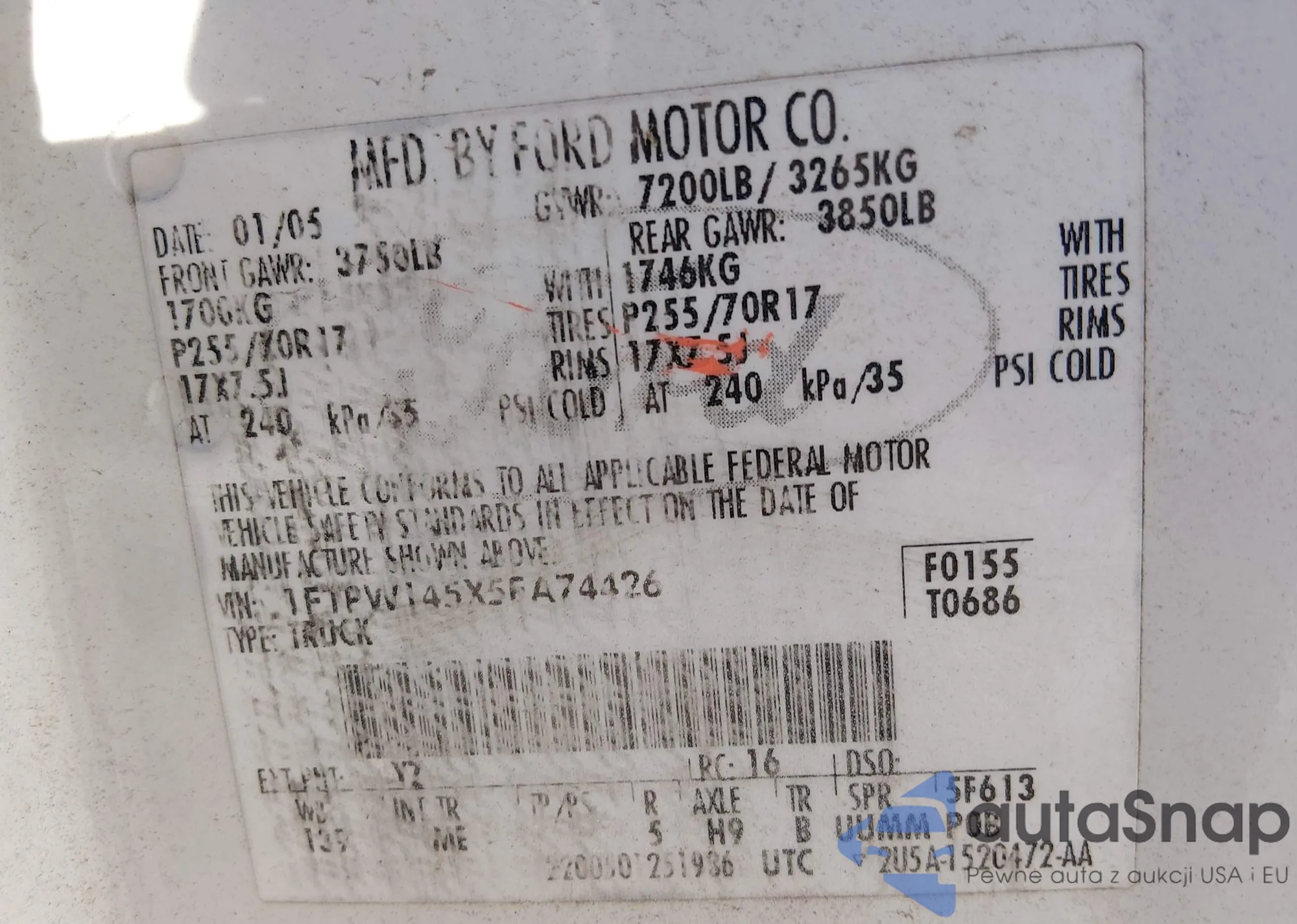 • VIN 1FTPW145X5FA74426