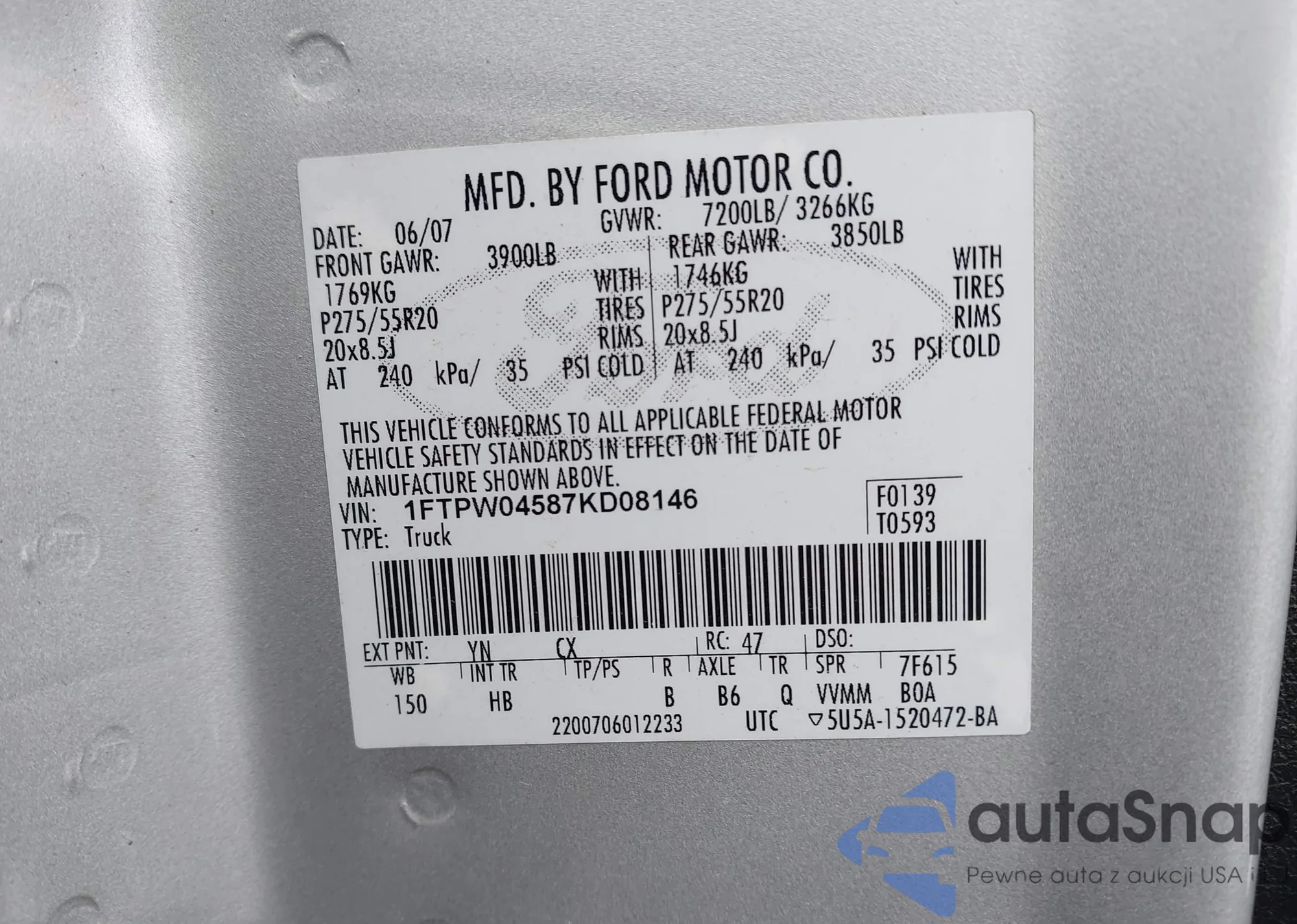 LOT: 44086828 VIN: 1FTPW04587KD08146
