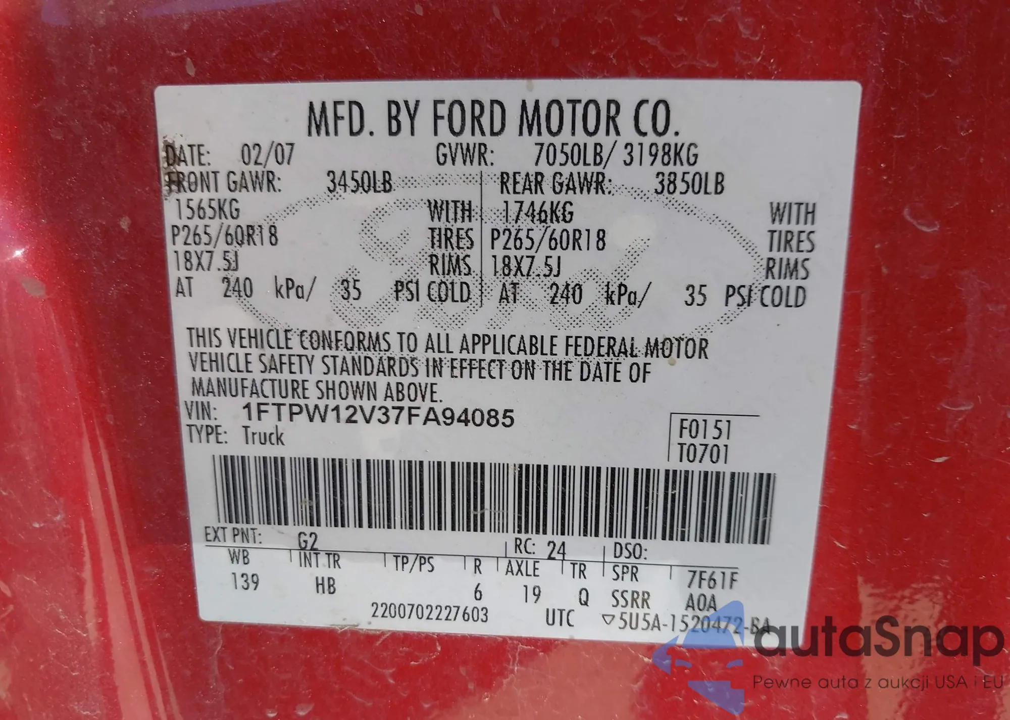 LOT: 43710713 VIN: 1FTPW12V37FA94085