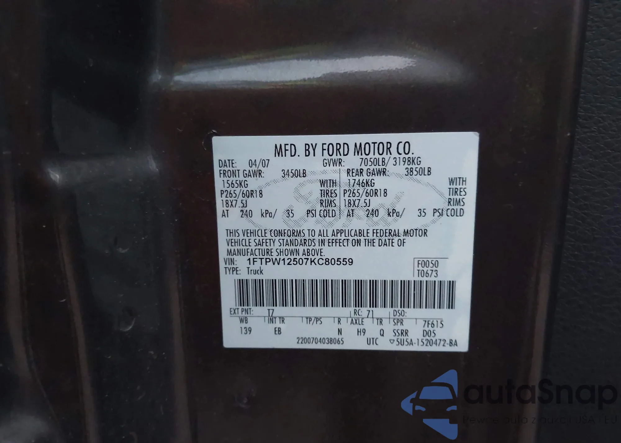 LOT: 43768253 VIN: 1FTPW12507KC80559
