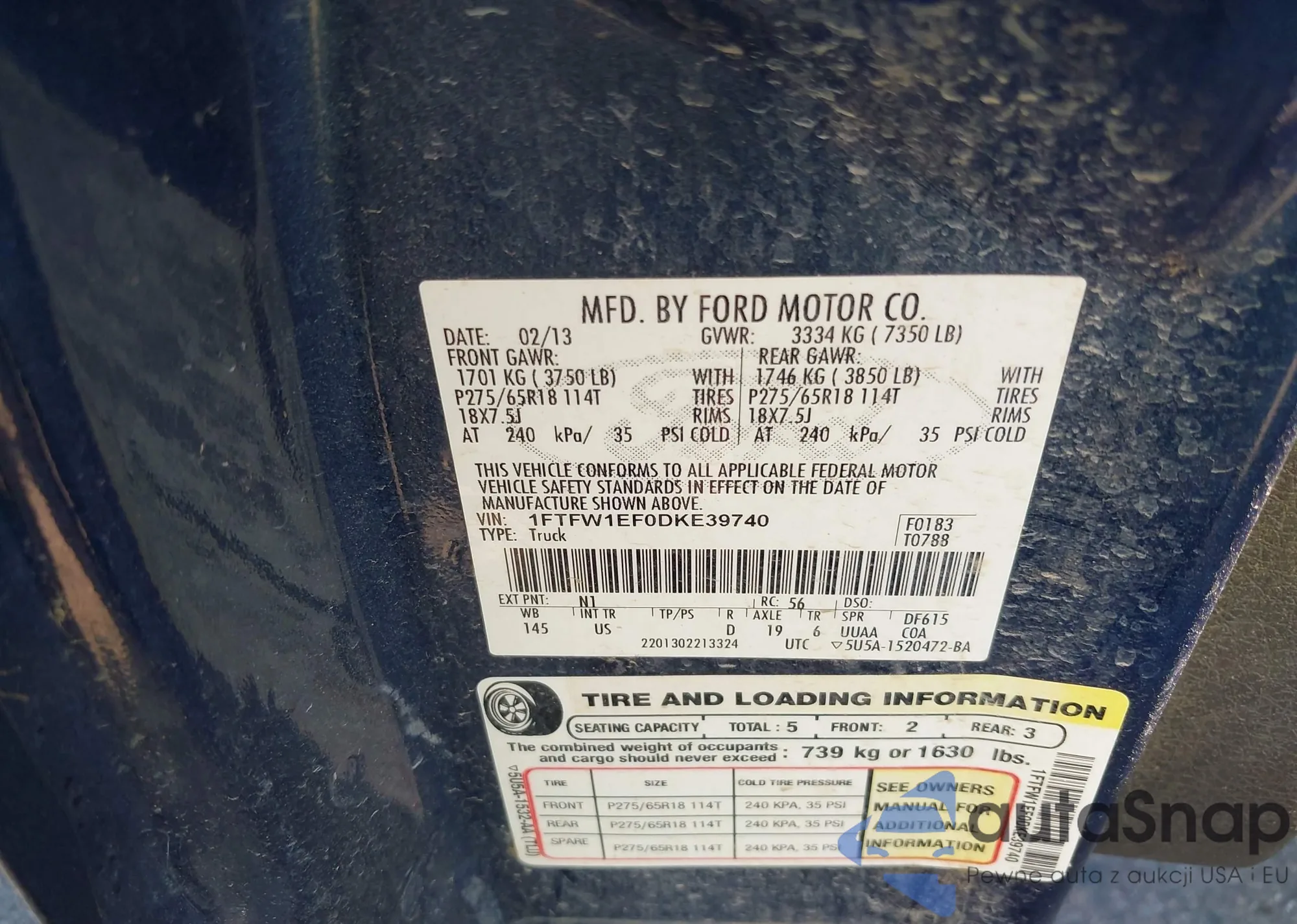 LOT: 43347686 VIN: 1FTFW1EF0DKE39740