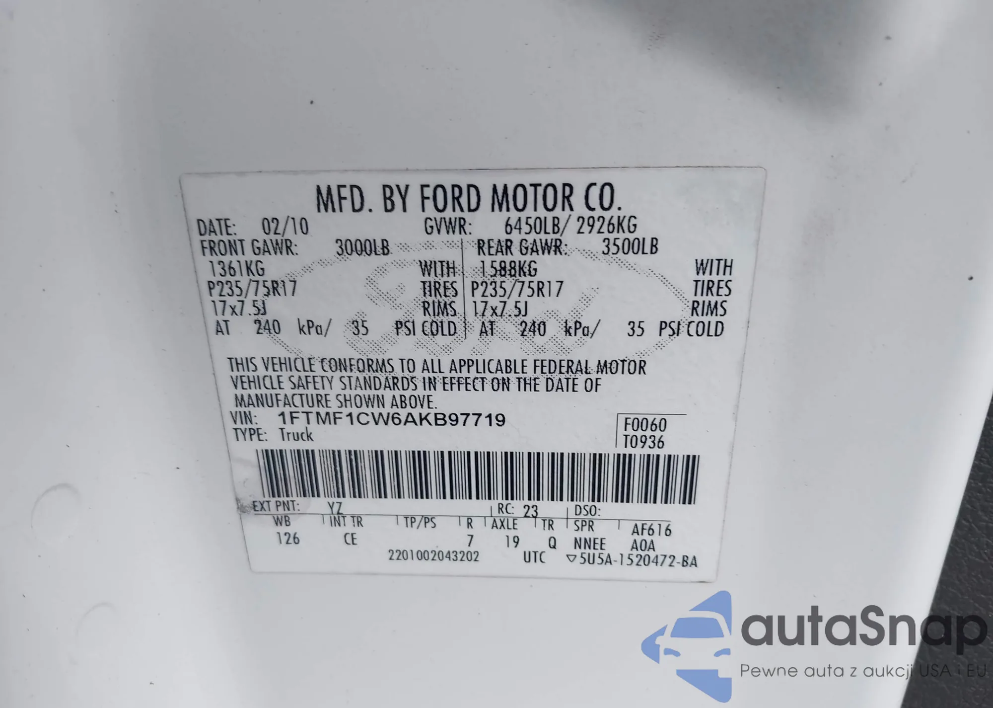 • VIN 1FTPW12V19FA61220