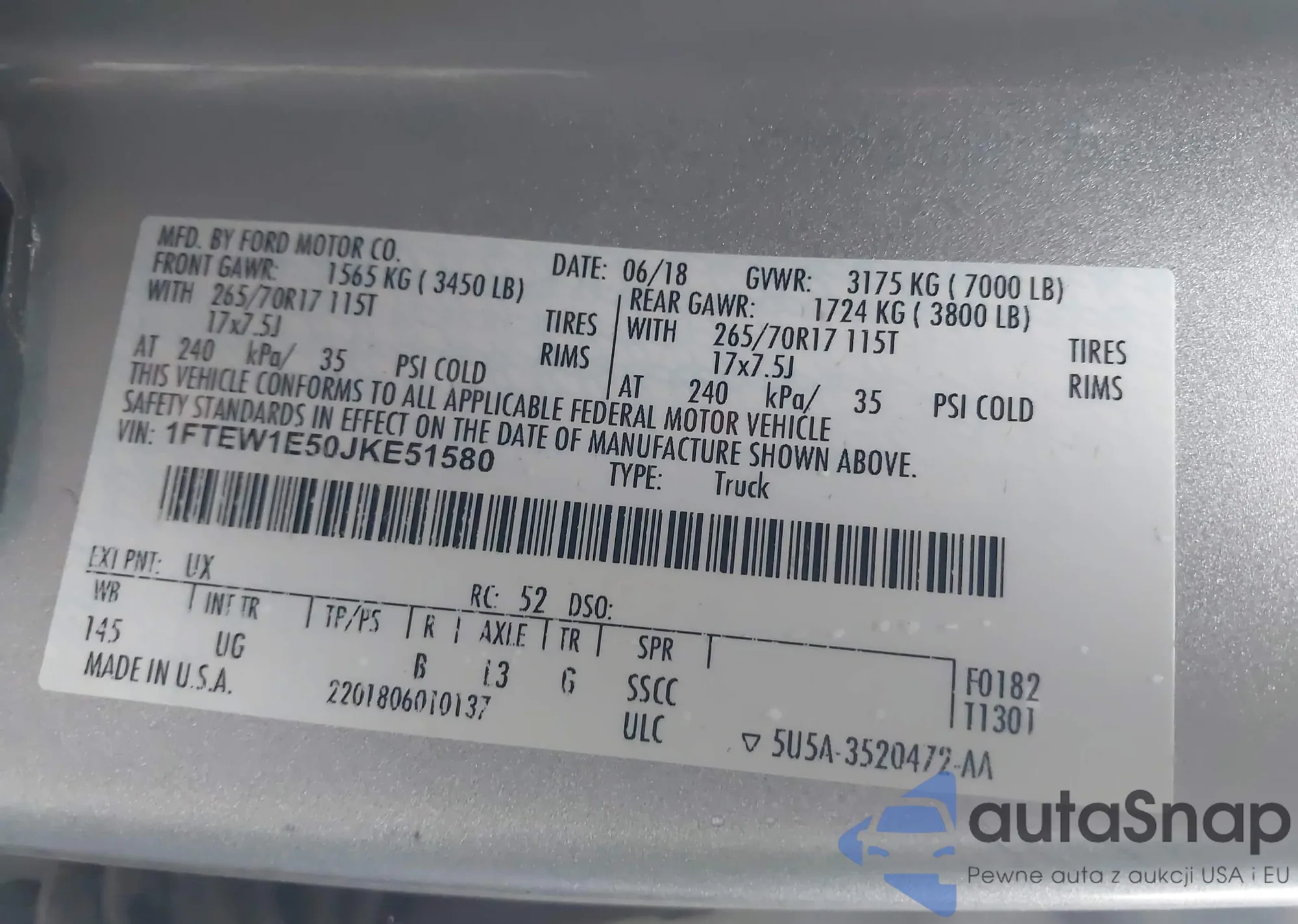 LOT: 44092488 VIN: 1FTEW1E50JKE51580
