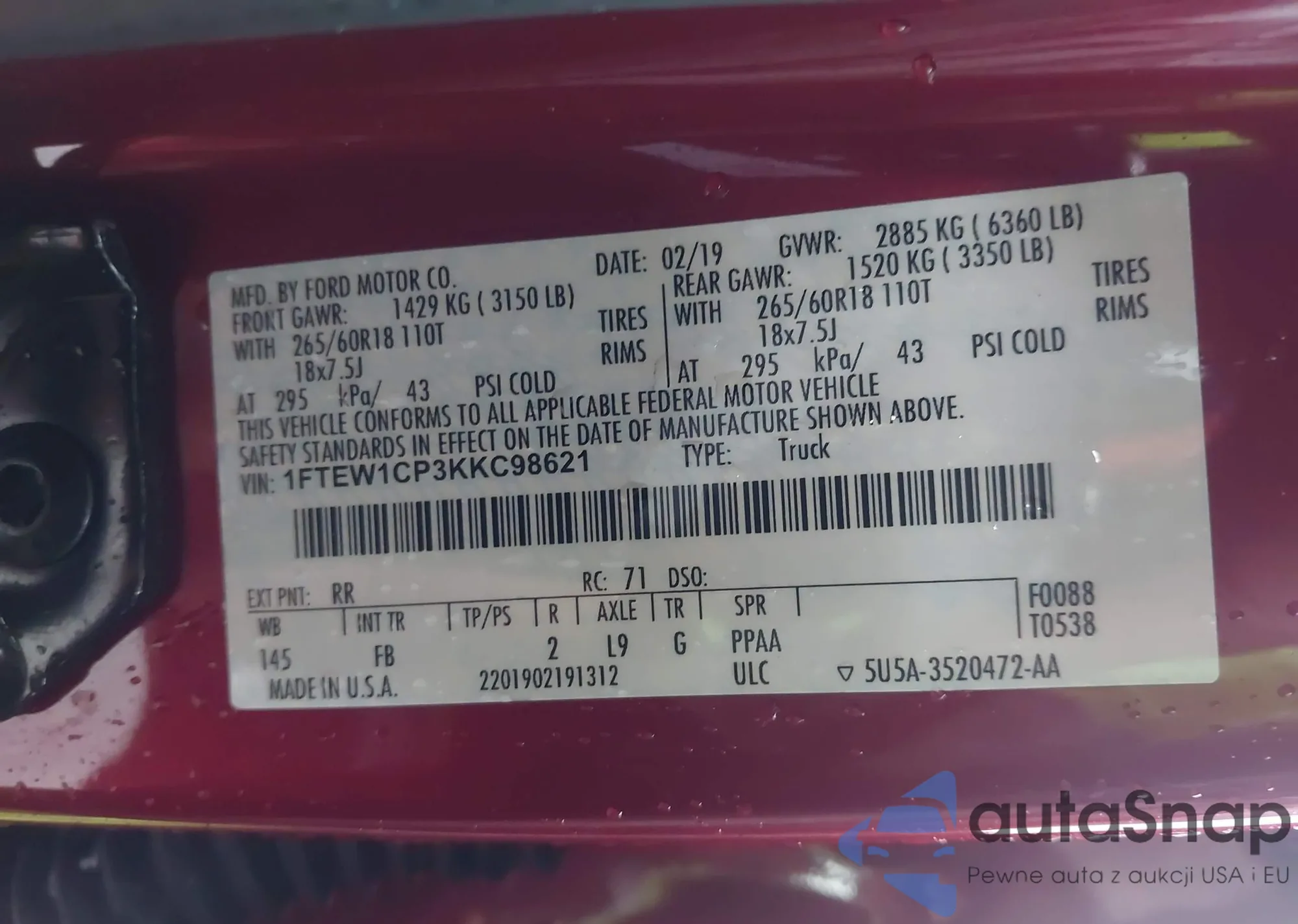 • VIN 1FTEW1CP3KKC98621