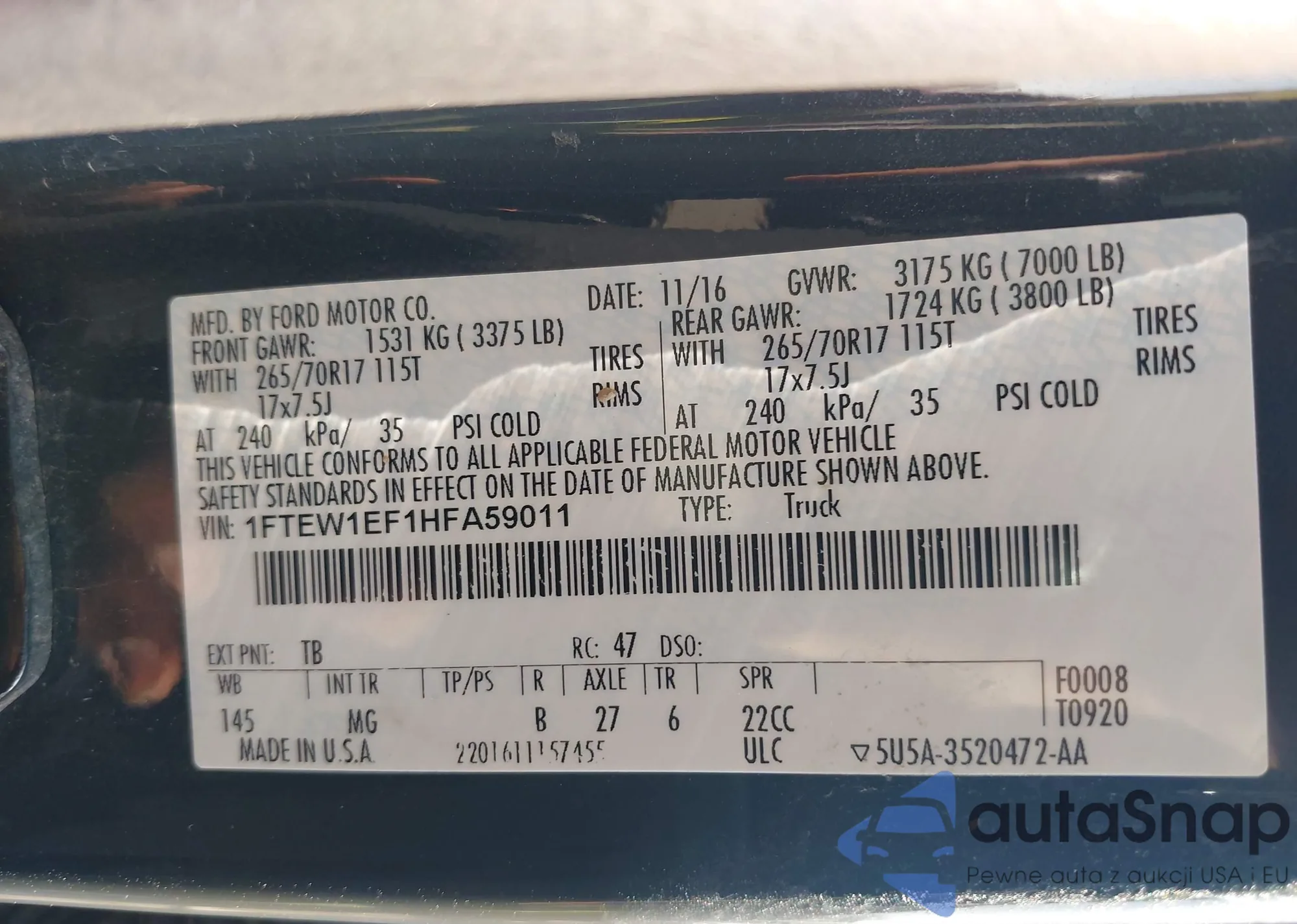 LOT: 42959535 VIN: 1FTEW1EF1HFA59011